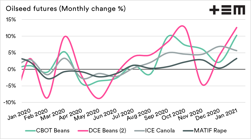 I’ve picked a selection of oilseed futures prices from our database. During the last half of 2020, most of the time we have experienced oilseeds ending averaging up each month.