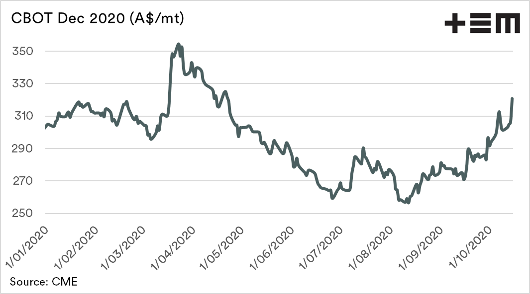 We saw overnight an increase overnight of 22¢/bu. When converted into A$/mt, this is an increase of A$15/mt. At present futures for this harvest are A$320.