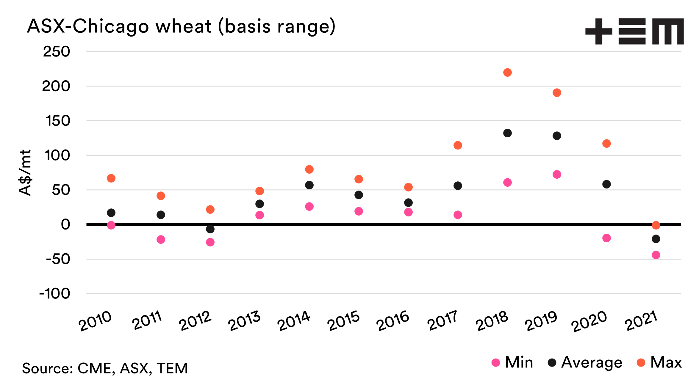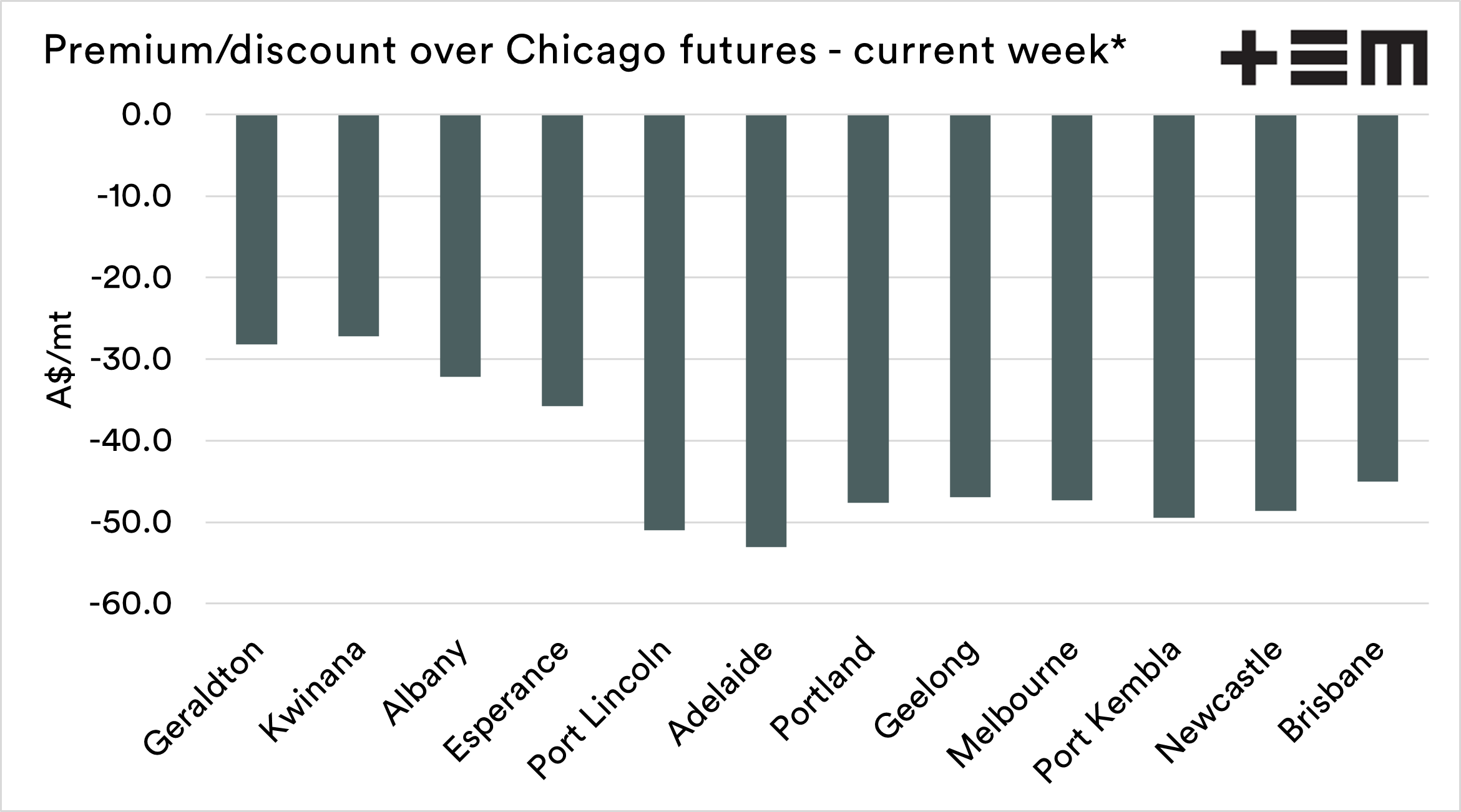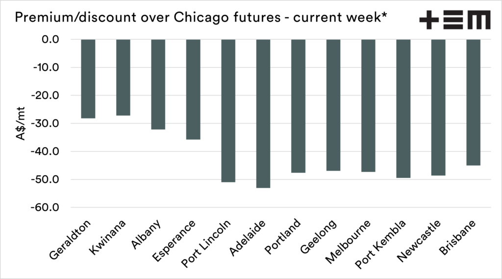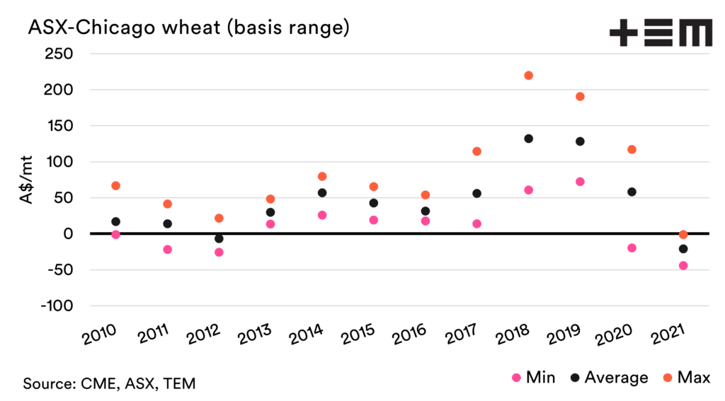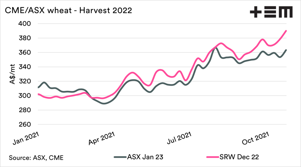 Firstly, let’s look at the futures market. The ASX contract for January 2023 averaged A$363 last week; at the same time, the CBOT wheat contract for December 2022 averaged A$390. This places ASX wheat at a large basis of -A$27.