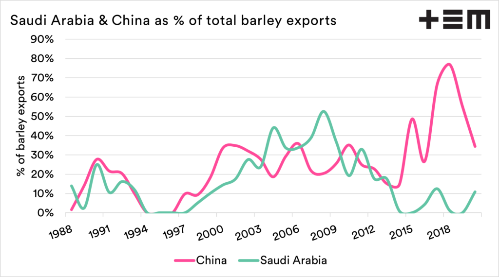 The first chart below shows the annual percentage of Australian barley exports which has been destined for China and Saudi Arabia. For much of the period in the 2000s and early 2010s, Saudi Arabia used to take a large percentage of our barley.