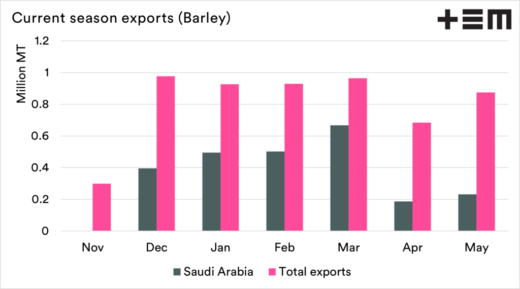 This year the pace into Saudi Arabia has been strong (see the second chart). Up until the end of May, Saudi Arabia has taken 44% of our total barley exports this season.