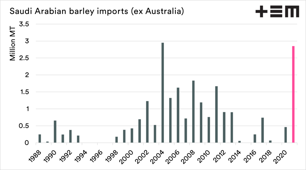 The final chart shows the annual exports of Australian barley to Saudi Arabia from 1988 to present. Up until the end of May, Australia has exported 2.8mmt. The record full-year volume to Saudi Arabia was 2.95mmt in 2004