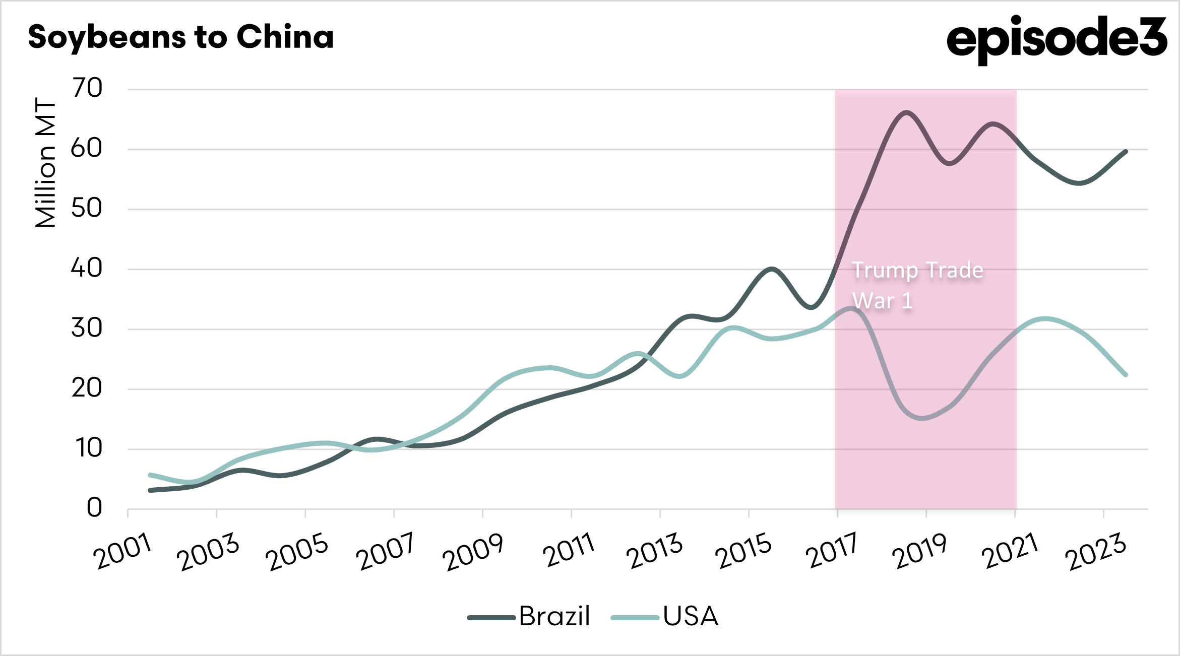 When China imposed tariffs on US soybeans in 2018 during the height of the US-China trade war, it significantly disrupted traditional trade flows. It opened up a major opportunity for Brazil. With US soybeans suddenly becoming more expensive for Chinese buyers due to tariffs, China turned to Brazil to meet its demand for soybeans. This led to a sharp increase in Brazilian soybean exports to China, boosting Brazil’s share of the Chinese market and strengthening trade ties between the two countries. As a result, Brazilian farmers enjoyed higher prices and increased production incentives, while Brazil solidified its position as the world’s top soybean exporter.
