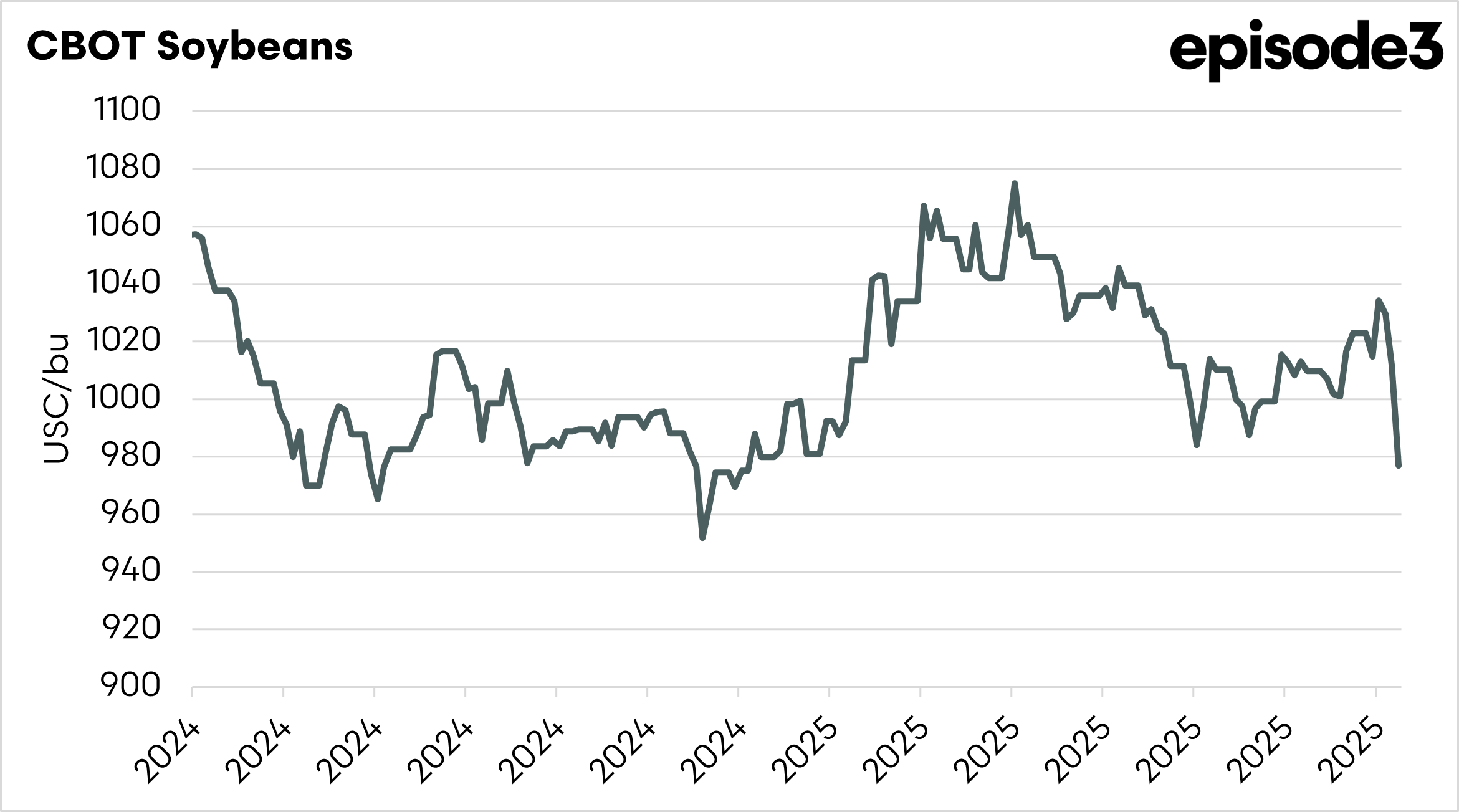 China has been hit with a 34% tariff, which stacks on top of the existing tariffs, giving them an overall 54% tariff on Chinese goods in the United States. As expected, China has retaliated and will now place a 34% tariff on top of the existing 15% tariff on soybeans.