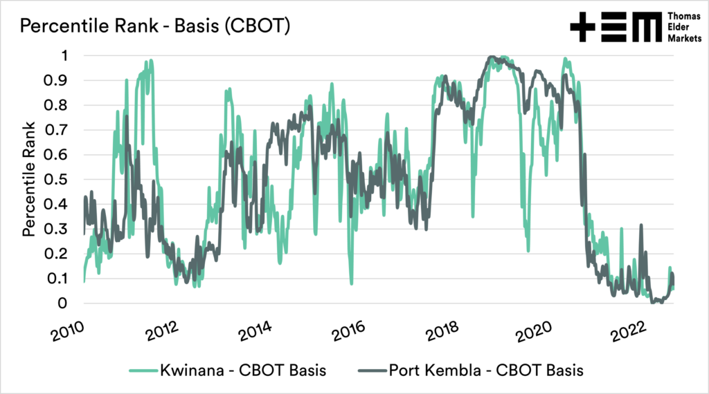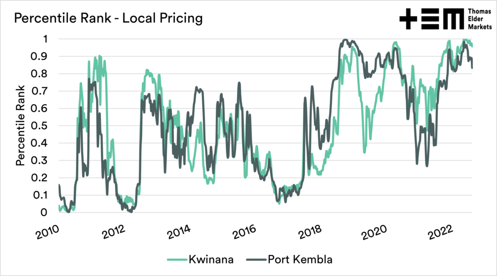 In the first chart below the physical price as a percentile is displayed. In reality, we have had some really strong flat prices over recent years. Through 2022, the price of wheat in Australia has been very high.