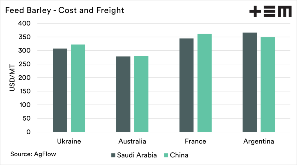 The chart below is a combination of the cost of purchase from the grower, the loading onto a vessel and the freight to the worlds two main barley destinations (Saudi Arabia and China).
