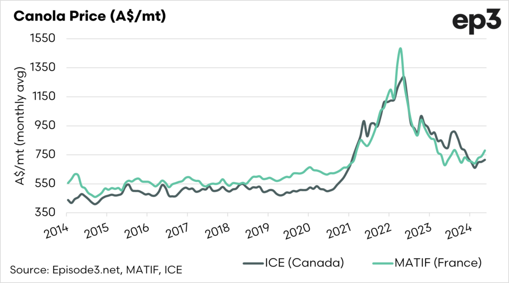 Currently, Australian canola prices remain trading at a significant discount to ICE futures. This may change if the Canadian crop goes okay and the European crop demands our canola.