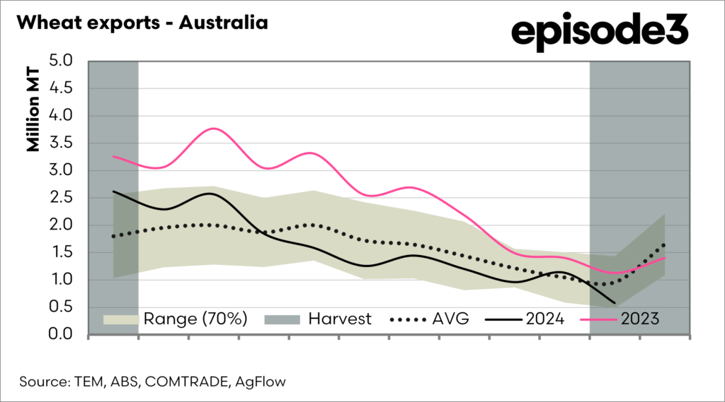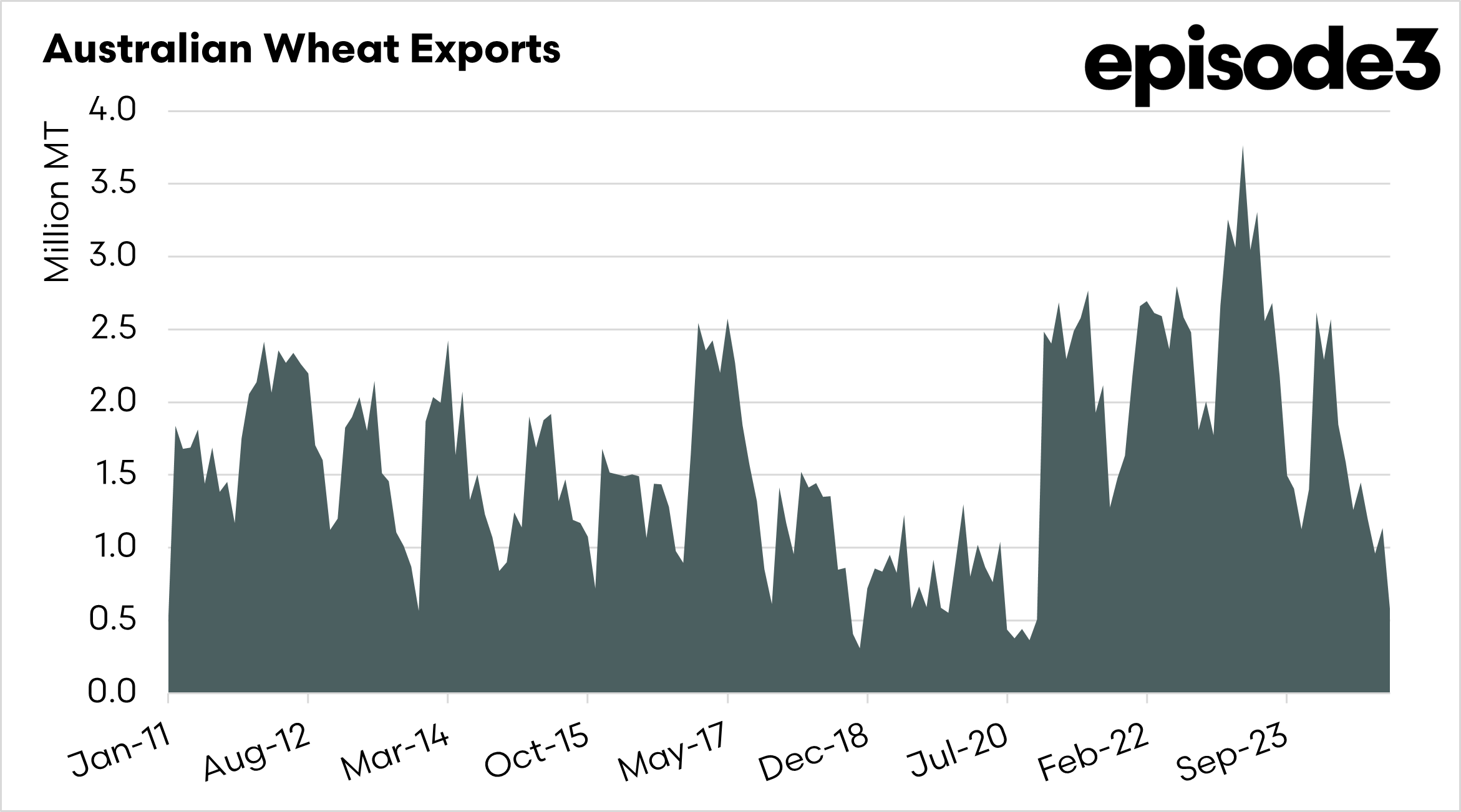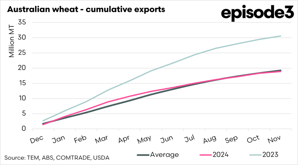 The Australian wheat export data is up to date as of November. In November, exports were down to 579kmt, from just over 1mmt in October. This is also massively down on last year’s 1.1mmt.
