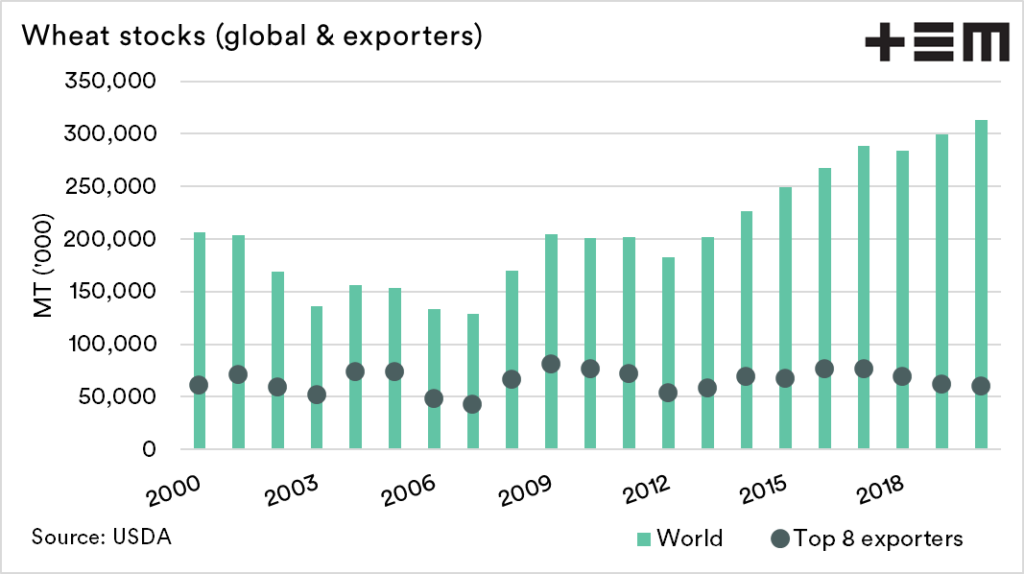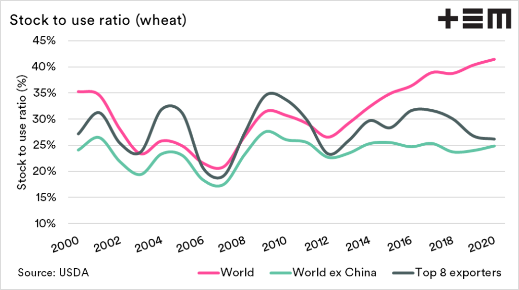The global picture for wheat is important, but it doesn’t necessarily tell you too much. Not all wheat is available, i.e. >50% of wheat is held in China. This is generally not available to the marketplace (if it exists at all).