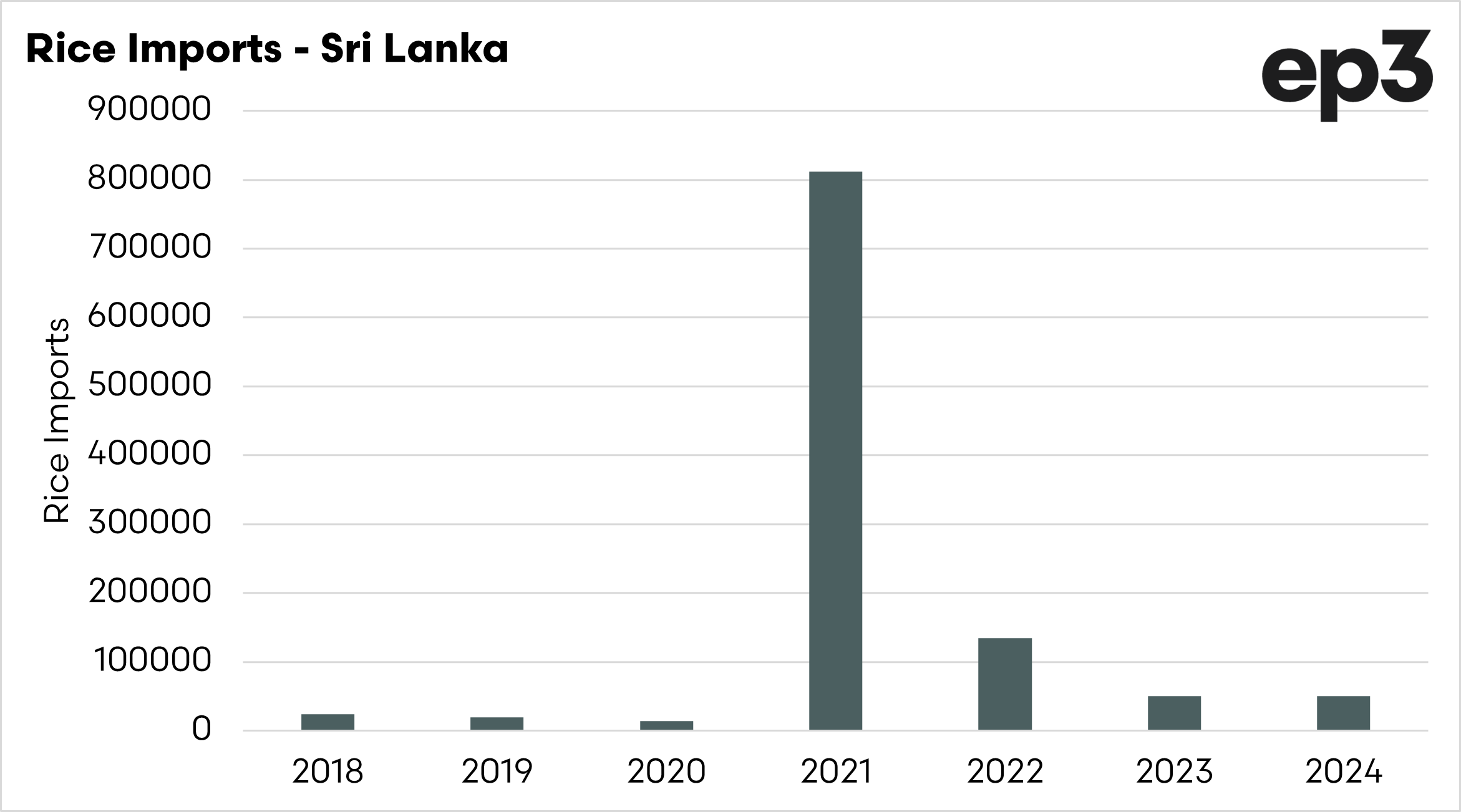 Rice is a staple food in Sri Lanka, and Sri Lanka is largely self-sufficient. In the second chart below, we can see that rice imports achieved record levels in the year and the following.