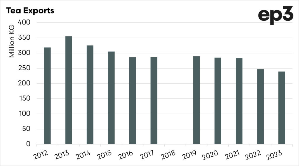 In addition to rice, tea is a major agricultural commodity. This brings significant export value to Sri Lanka and its producers. In the third chart below, we can see that the volume of tea exports dropped significantly in the years after the ban.