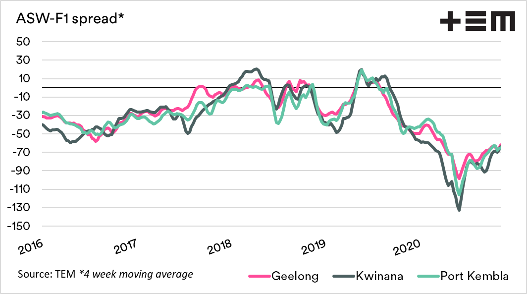Traditionally the spread between ASW to F1 has been a discount of around A$20-30. In the recent years of drought that spread narrowed due to strong domestic demand. During the recent rally in grain prices from September, the barley prices have increased at a greater rate.