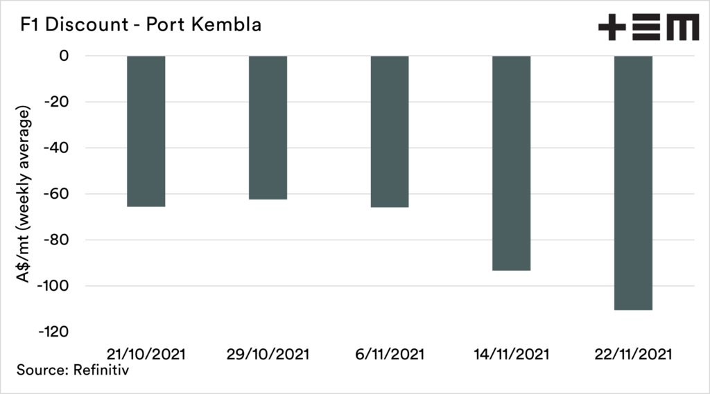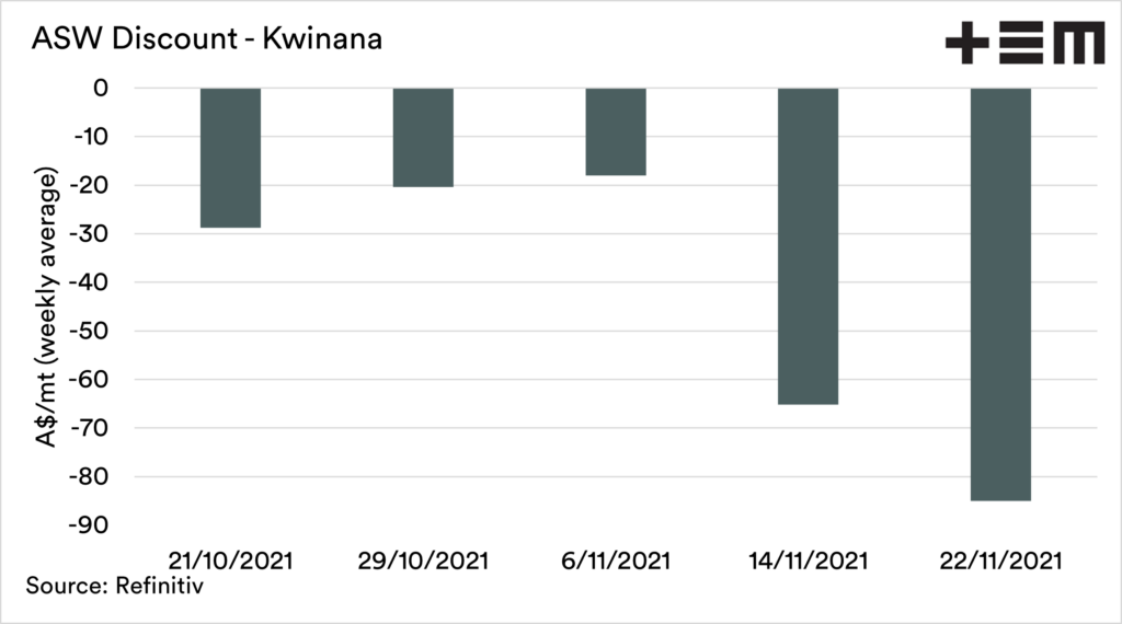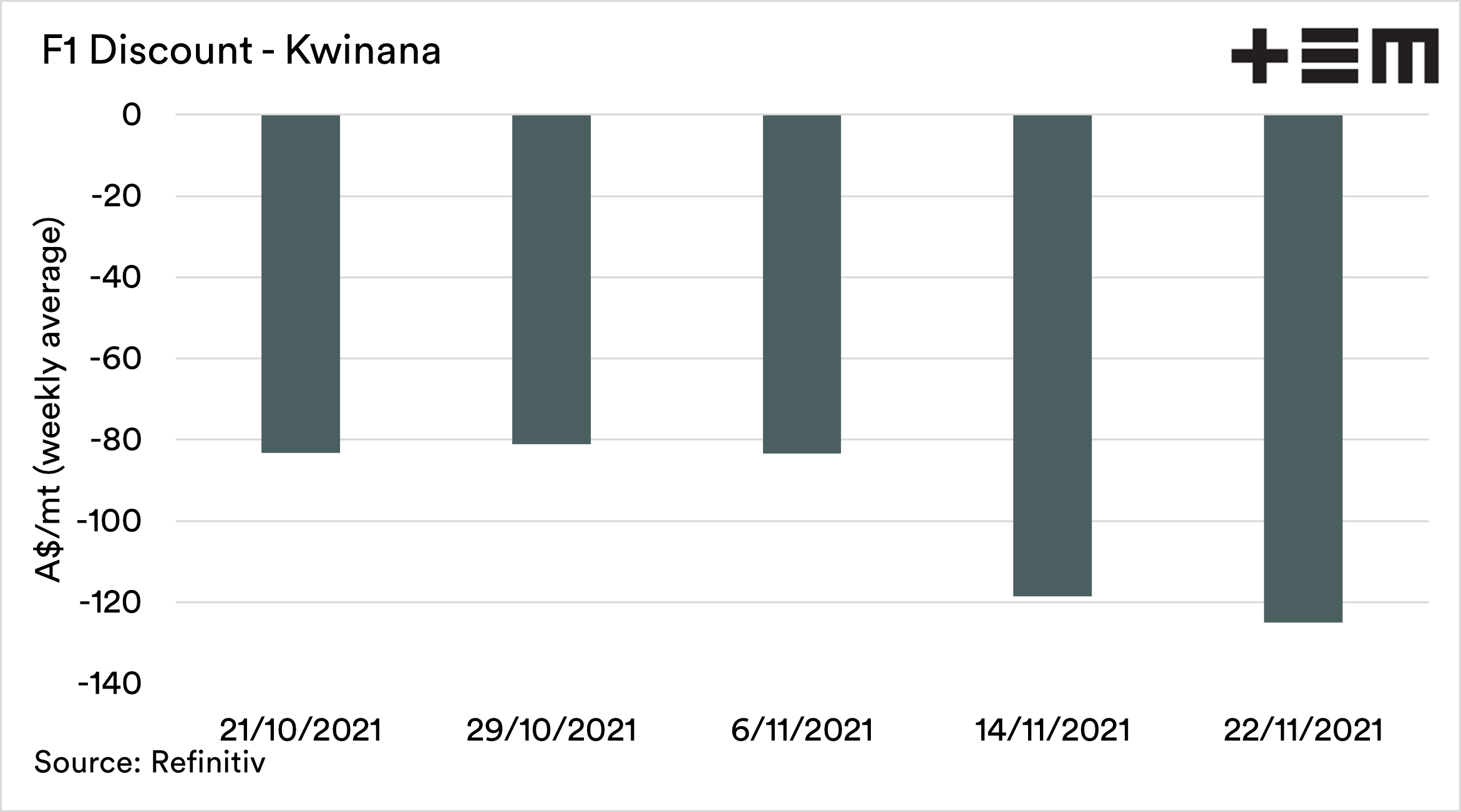 This is also having an impact on barley. The second and third chart shows the F1 discount to APW in Kwinana and Port Kembla. It is also blowing out to very large discounts.