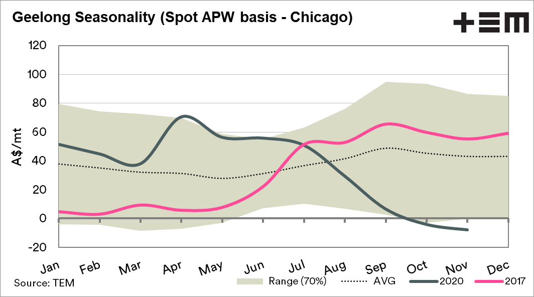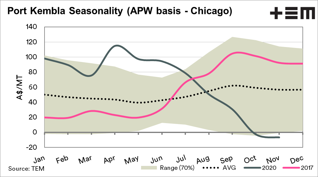 The charts below show the seasonality of basis from spot physical to spot Chicago for Geelong and Port Kembla. Overlaid is the average basis for 2017 and 2020.