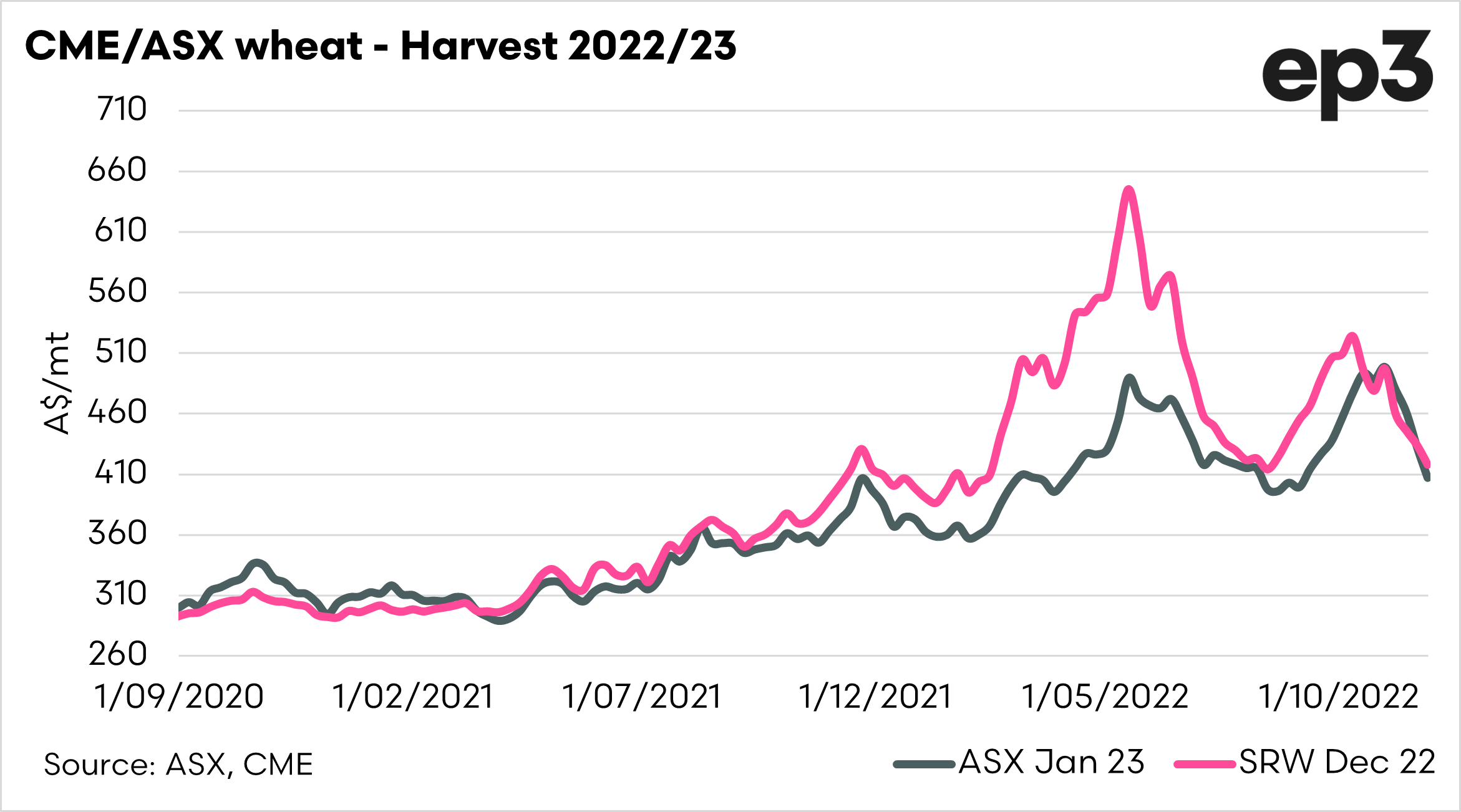 The first chart below shows ASX wheat vs CBOT wheat futures for this harvest. ASX is effectively and APW (or above) contract. In recent weeks it has been moving in between a premium and narrow discount. So it’s all good, basis is back to near normal levels or is it?