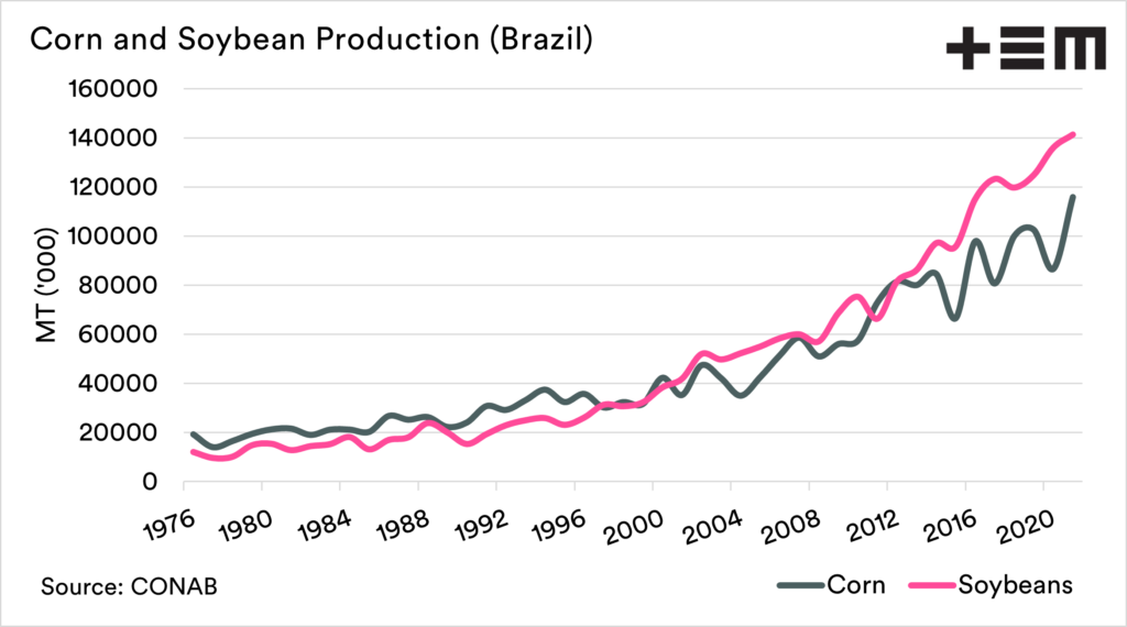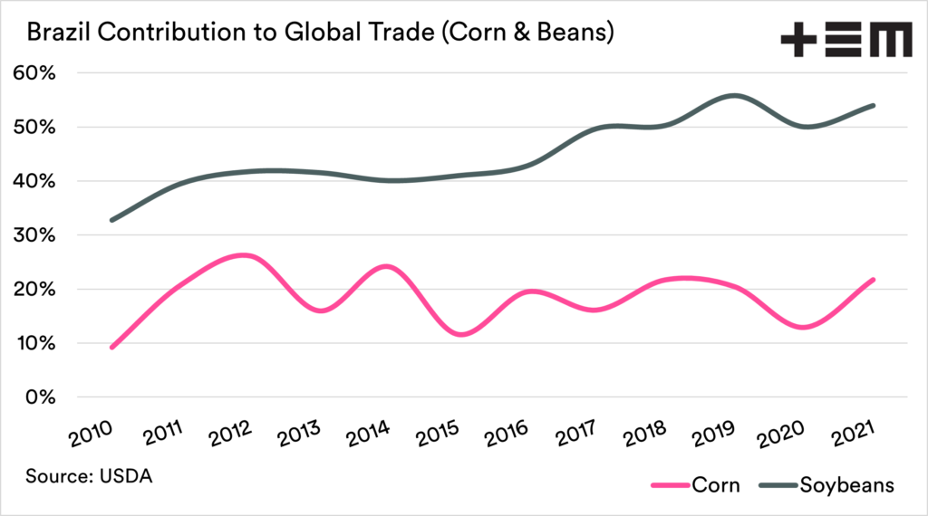 The first chart below shows the importance of Brazil to the global trade in Soybeans and Corn. Whilst we don’t grow vast quantities of these commodities, they do influence our pricing. For soybeans,  movements flow through to Canola. Corn, as we all know, can be a driver of wheat pricing.