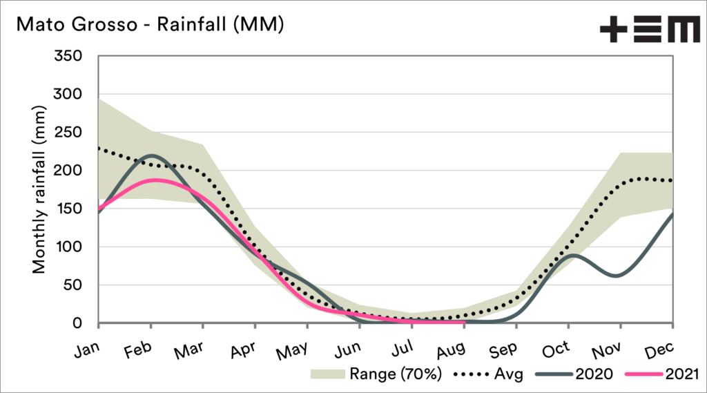 The second chart shows the seasonality of rainfall in Mato Grosso, one of the main growing regions. It is typical to have dry weather during this period. However, this region has been experiencing below-average rainfall throughout most of 2021, and the end of 2020.