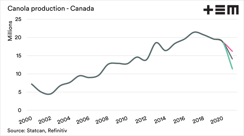 The average production of canola since 2010 has been 17.7mmt. Production has not been at sub 14m since 2012. Domestic consumption of canola in the past two years has been between 10.5 to 11mmt. If the lower end of the range eventuates, there will be little leftover for exports.