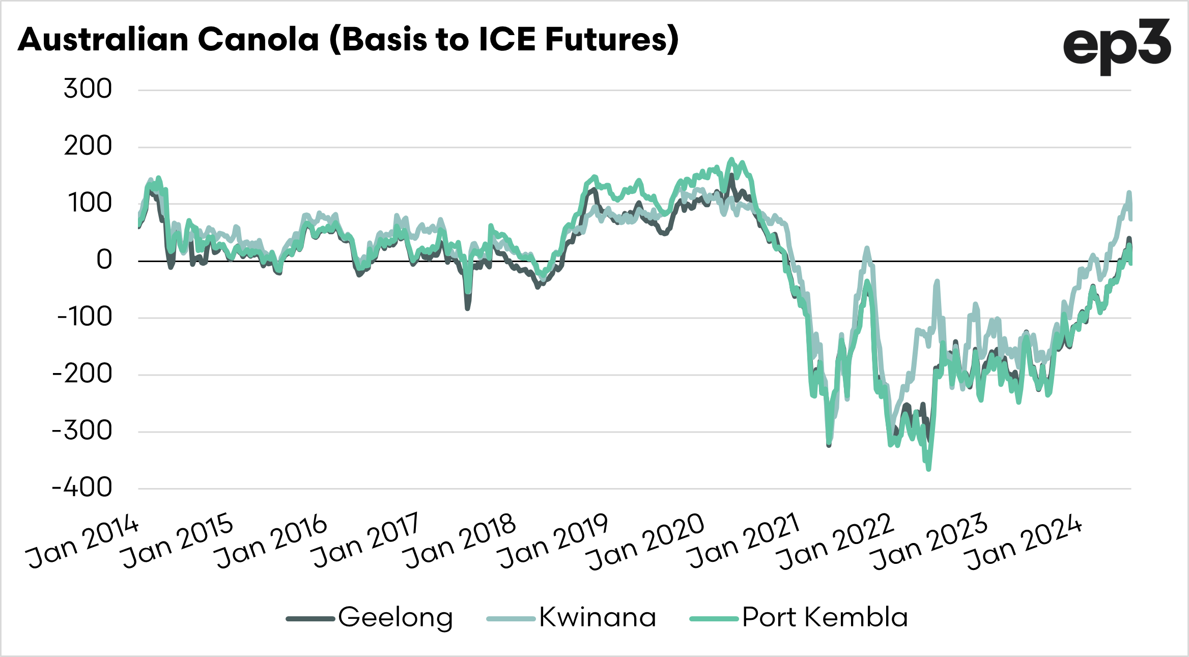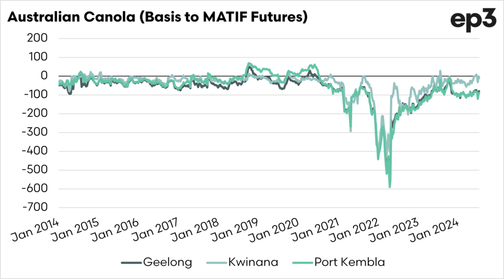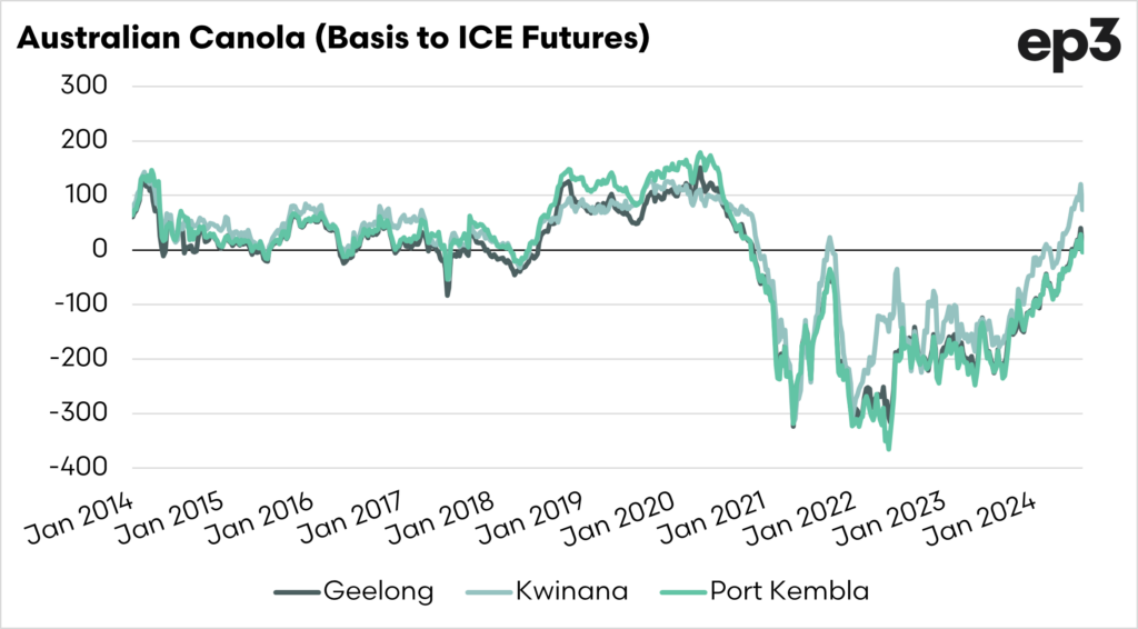 The canola market in Australia has been heavily discounted to overseas values for a long time. In fact, most of the time, it has been since 2021. That has now started to swing.