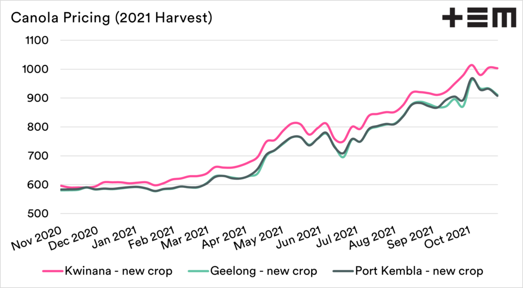 The fall has been most felt in the eastern states. As an example, in Port Kembla, the canola price averaged A$963 for the first week of October. Last week it averaged A$911. In WA, the price has largely stayed stable in recent weeks