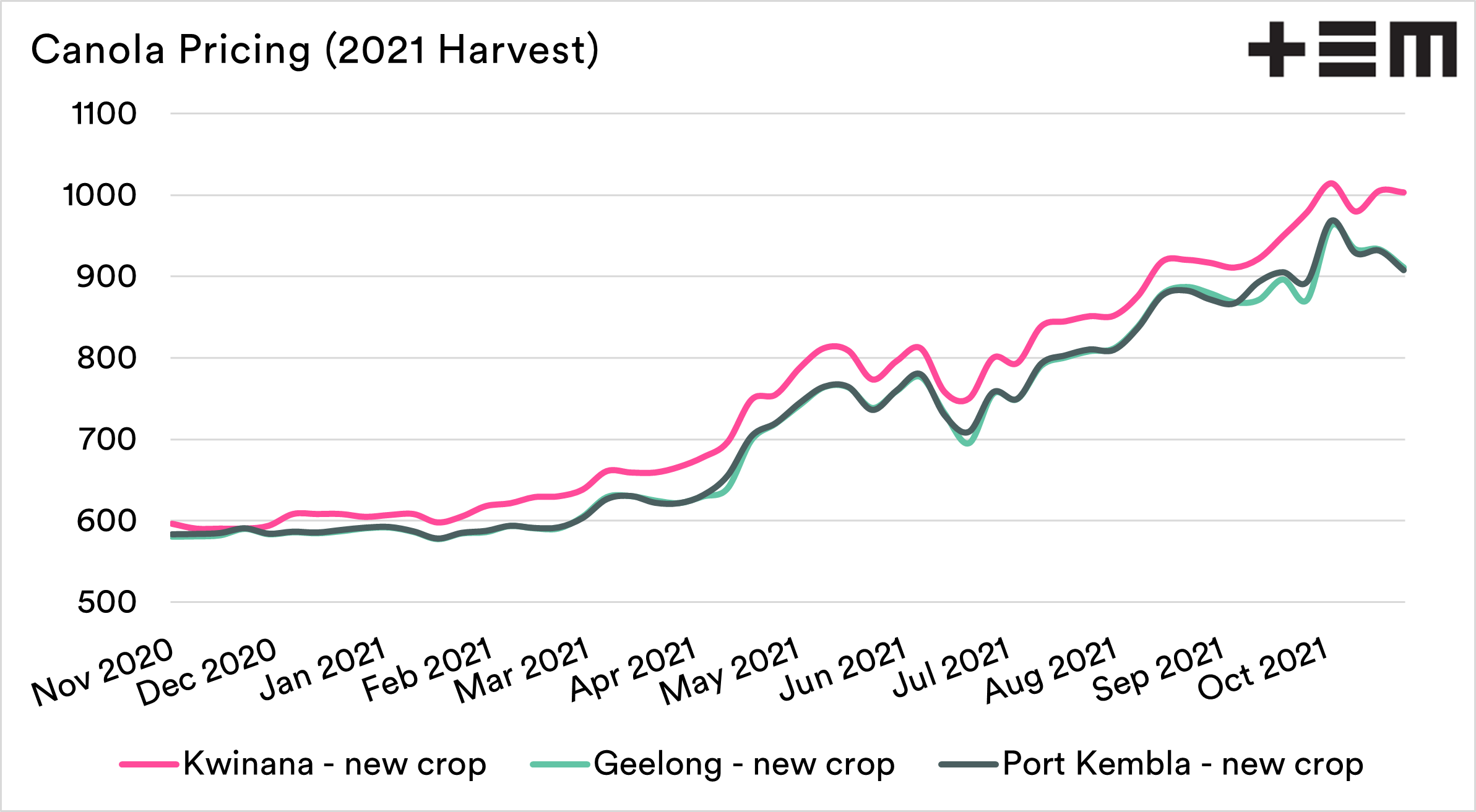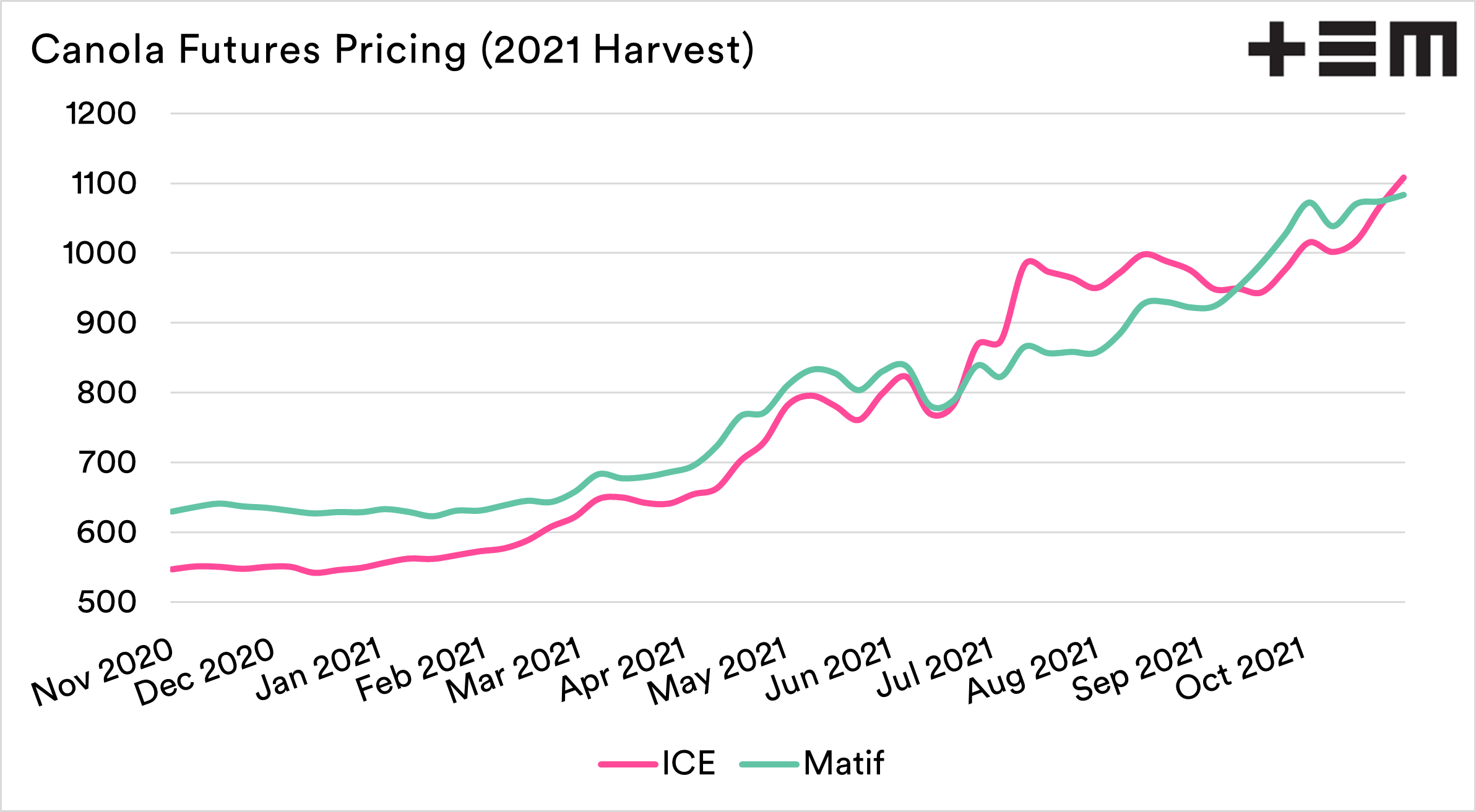 As an exporter, our canola price is based on the price of futures, plus (or minus) our basis. The chart shows the futures price for our harvest for ICE (Canada) and MATIF (France). We can see that they have been tracking each other pretty closely for most of the year.