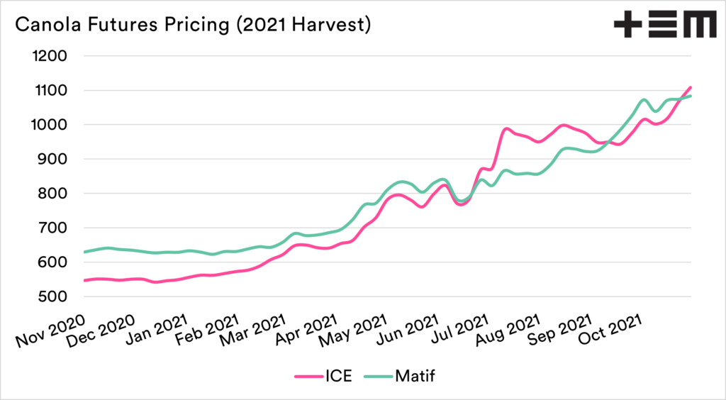 - MATIF and ICE canola futures have gained and hit new contract peaks in recent weeks.