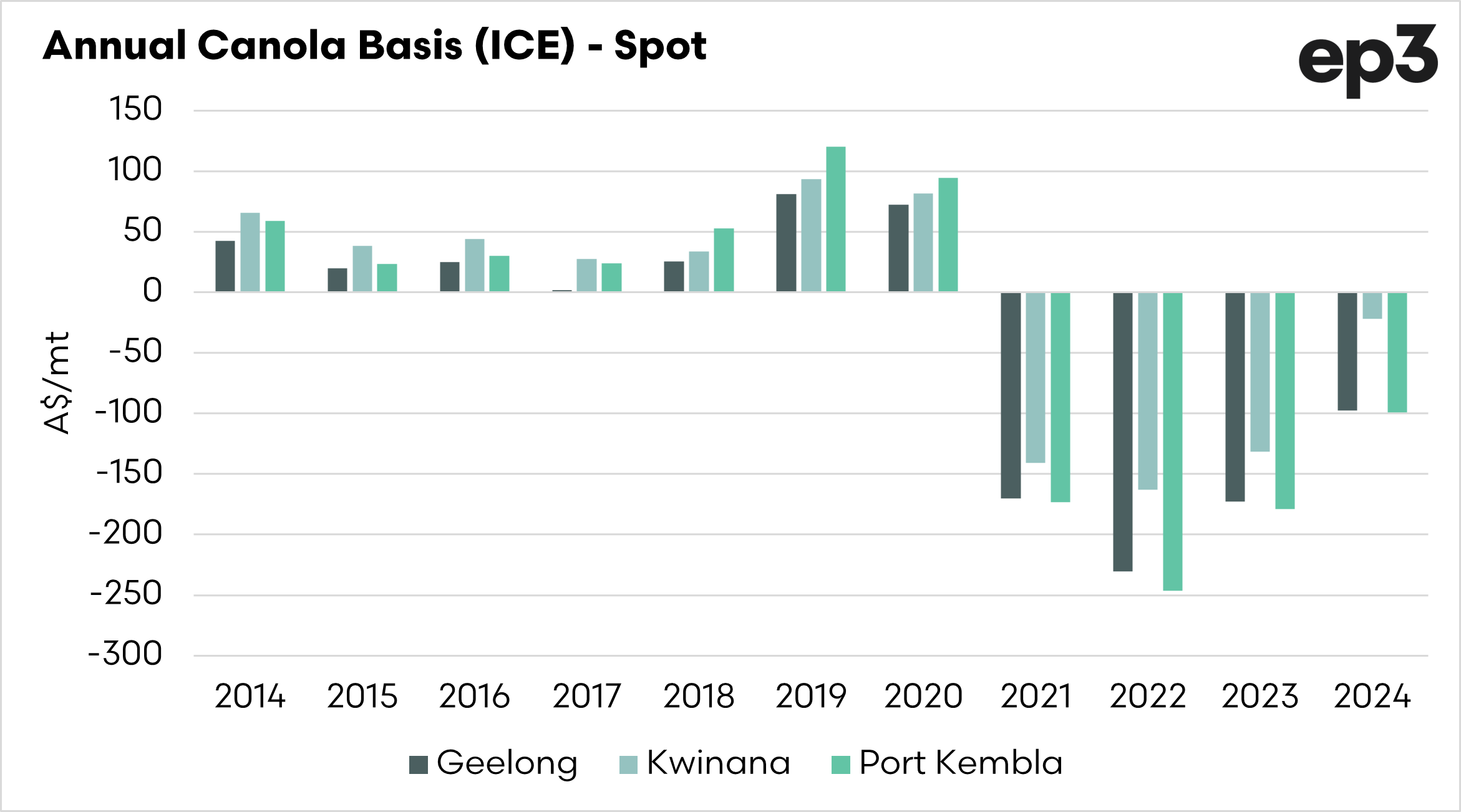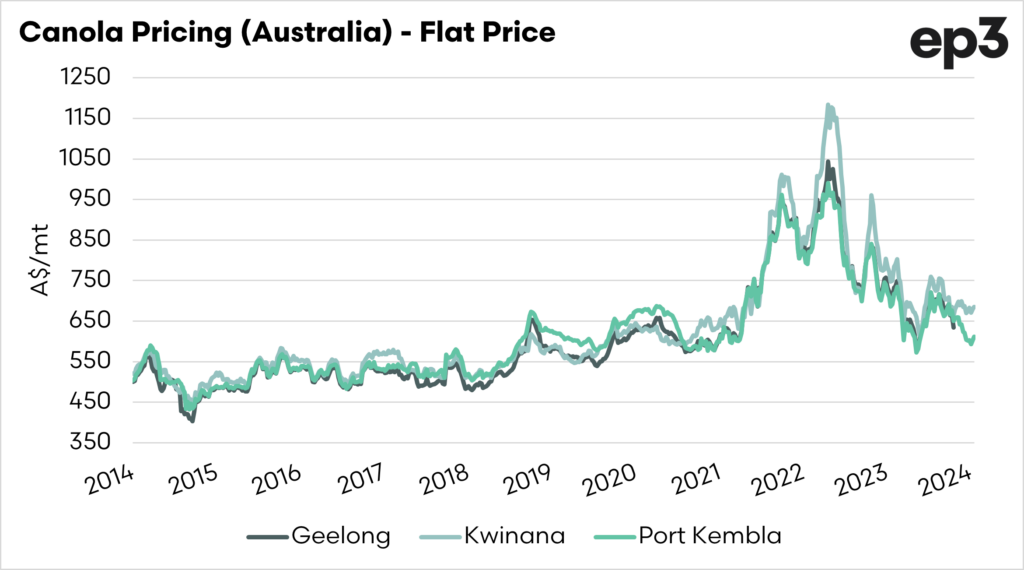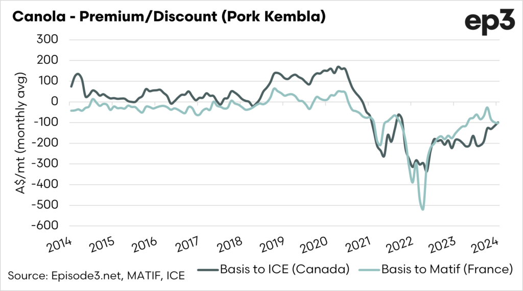 Australian canola prices have been at a discount to overseas values for much of the past three years, but the basis has returned to its best level since 2021.