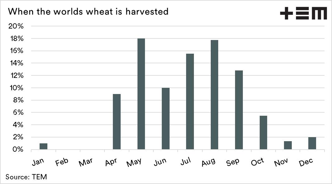 To display this clearly, I have worked out how much of the worlds wheat is harvested each month. When the rest of the worlds headers go to sleep, that is when ours awaken.