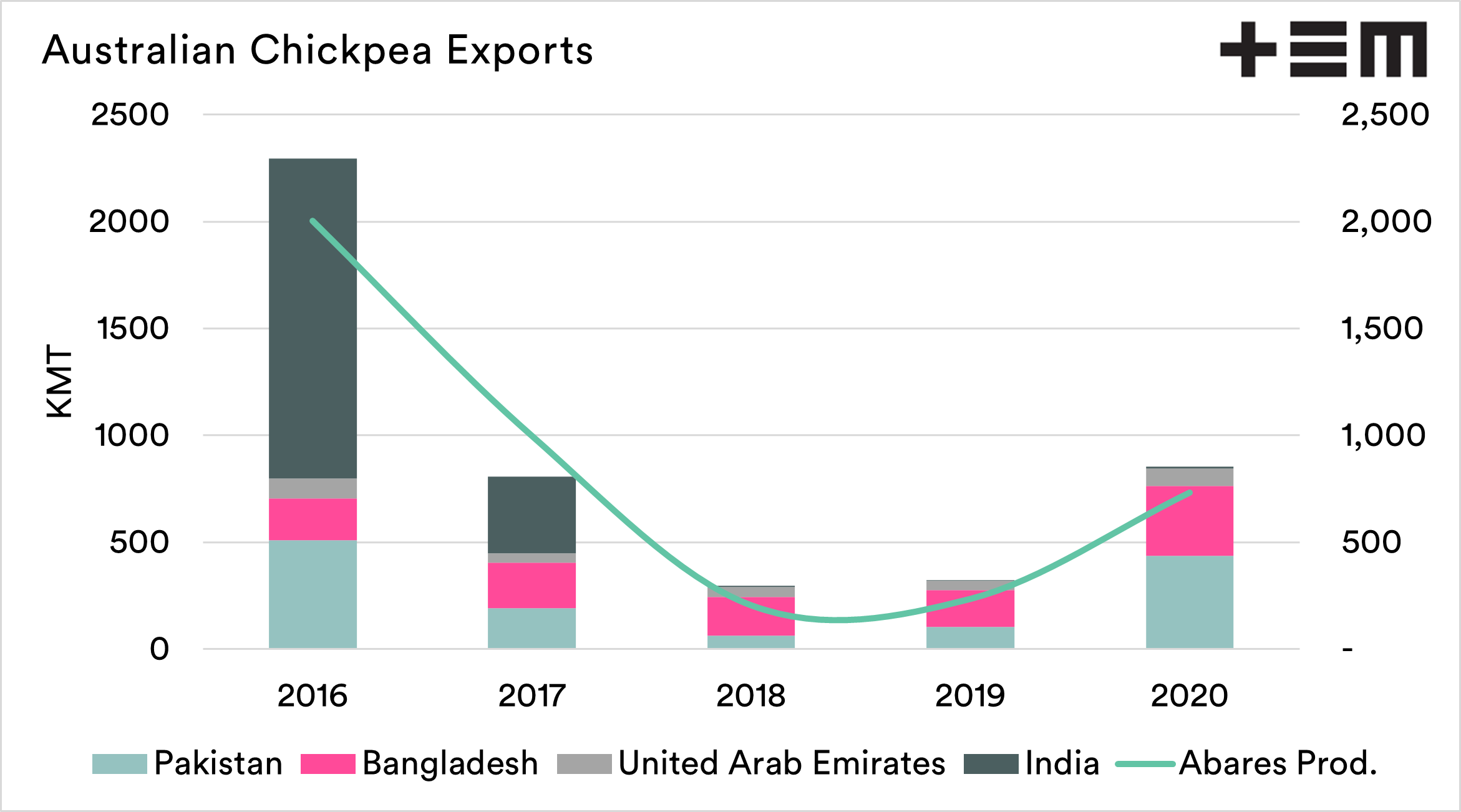 ABARES reported production and ABS reported trade statistics indicate that more often than not the chickpea exports have been higher than the production estimate itself. In MY 2020/21 (Oct-Sep), the country exported 969 KMT of chickpeas versus ABARES reported production of 732.5 KMT. Similarly, the production was lower in last four years out of five instances.