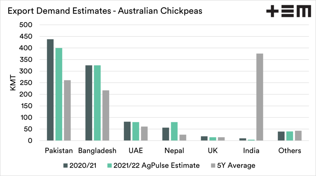 India is unlikely to ease the restrictions on import of either yellow peas or chickpeas in year 2022. There have been rumours that the elevated Indian prices have made the movement of pulses from neighbouring Bangladesh and Nepal profitable.