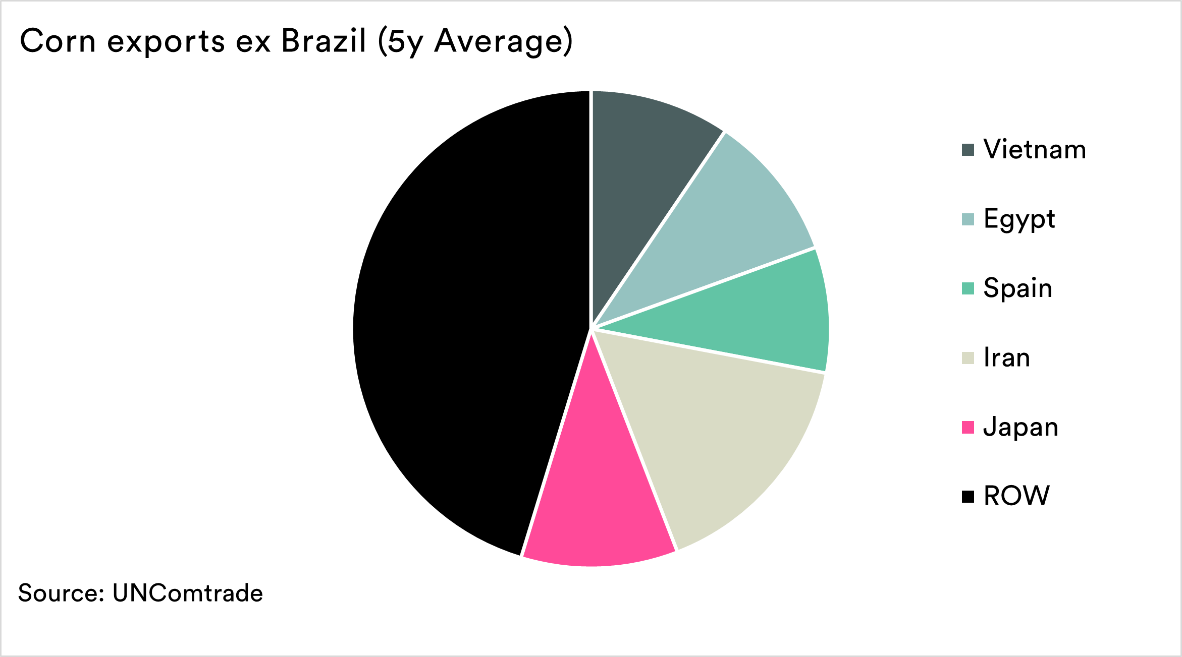 This is quite a dramatic change to global corn trade flows and could further reshuffle the decks. The first chart below shows the top five destinations for Brazilian corn. These nations will now be competing with China.