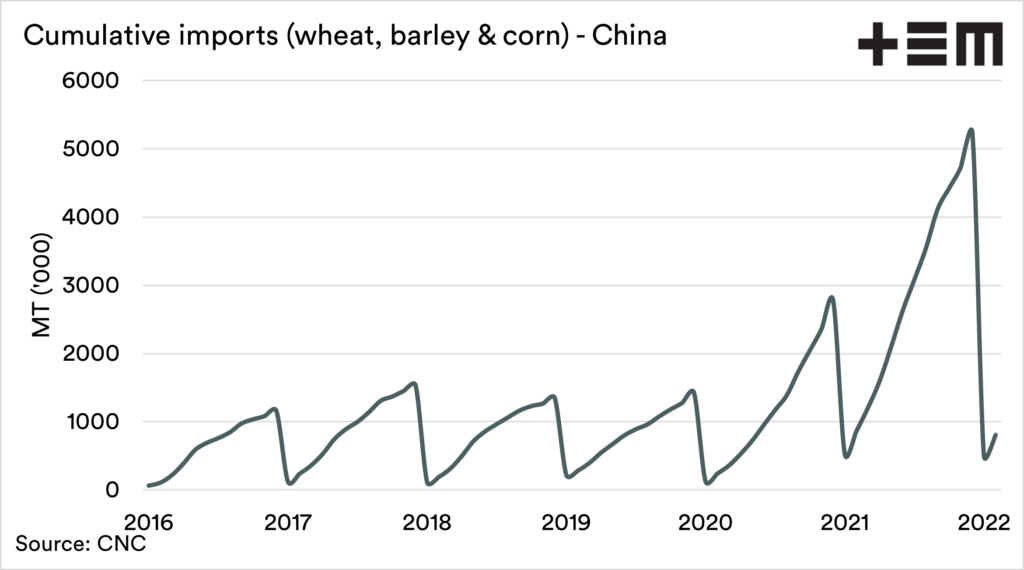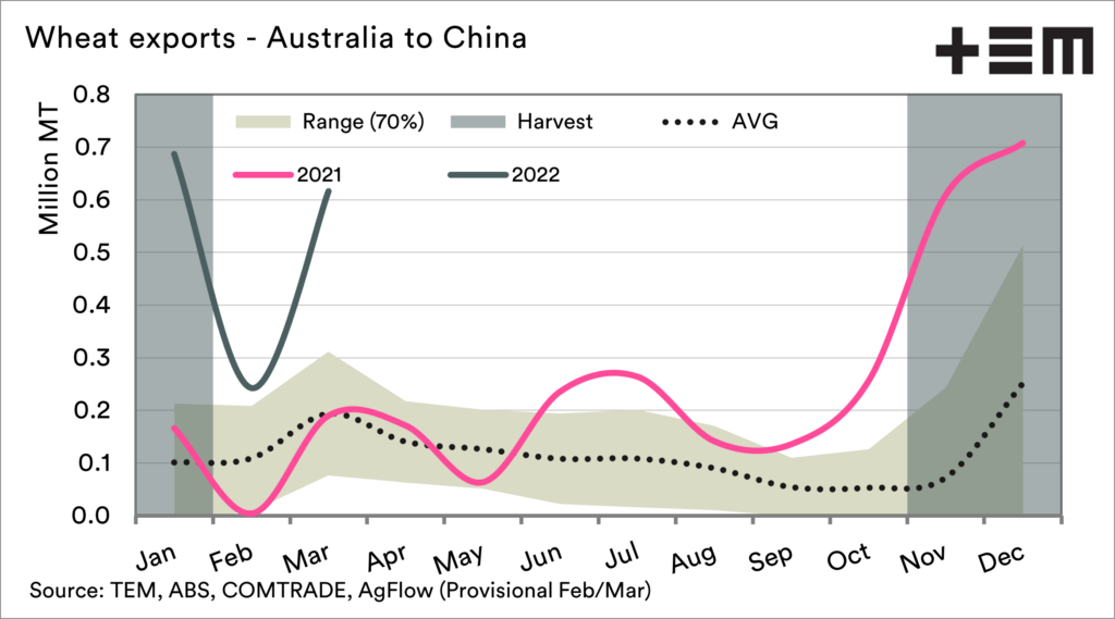 The good thing for Australian farmers is that China is buying a power of Australian wheat. The third chart below shows the seasonality of exports to China, along with 2021 and 2022 so far. The February/March data is provisional data based on shipping stem information provided by AgFlow.