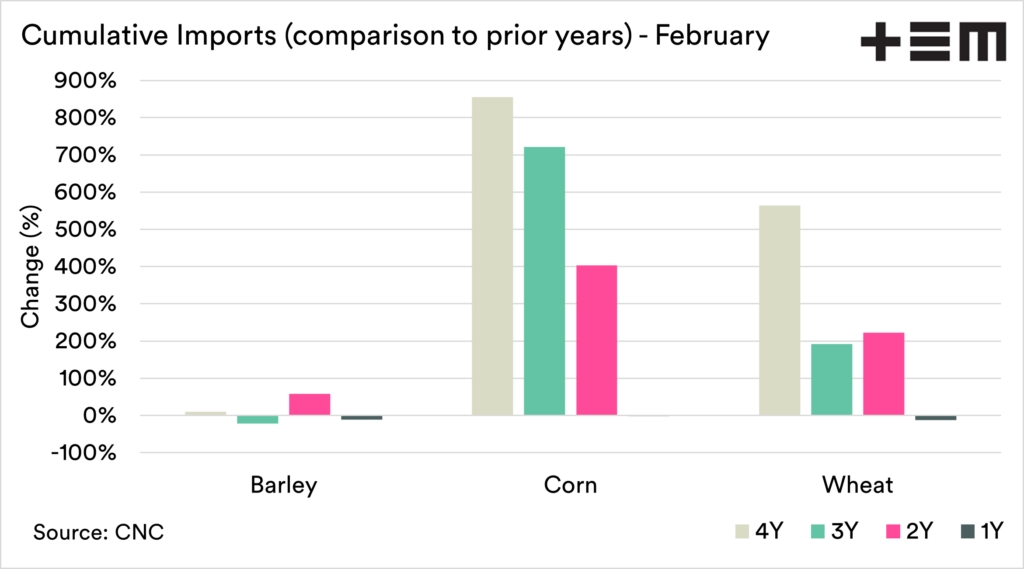 The second chart compares volumes up until the end of February over the past four years. The volumes are massively up more so for wheat and barley compared to 2 to 4 years ago. In comparison to last year, Chinese imports are slightly down.