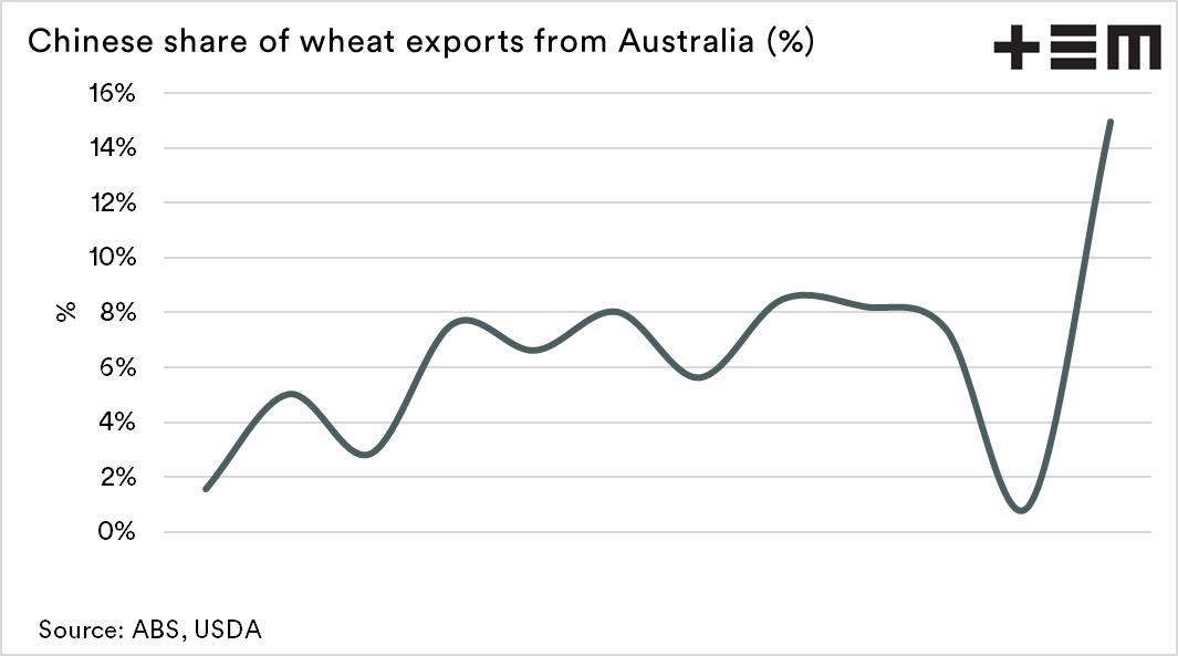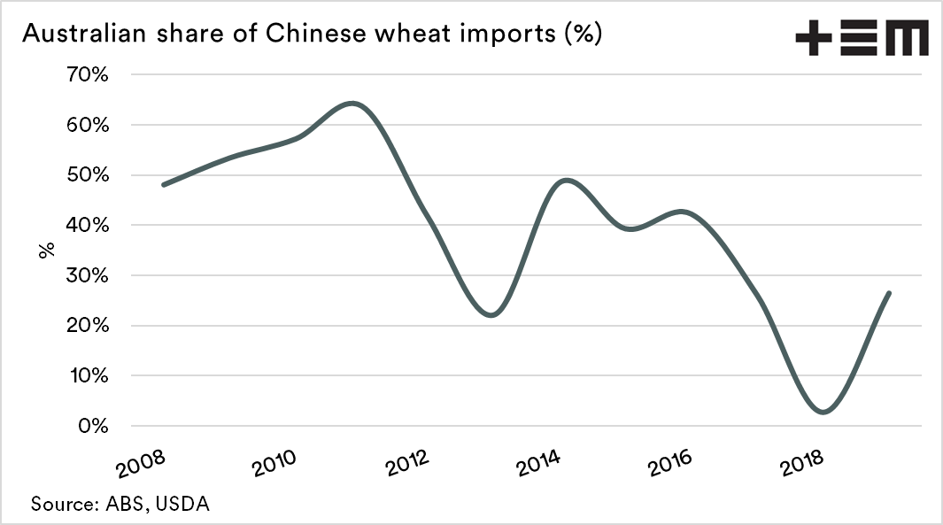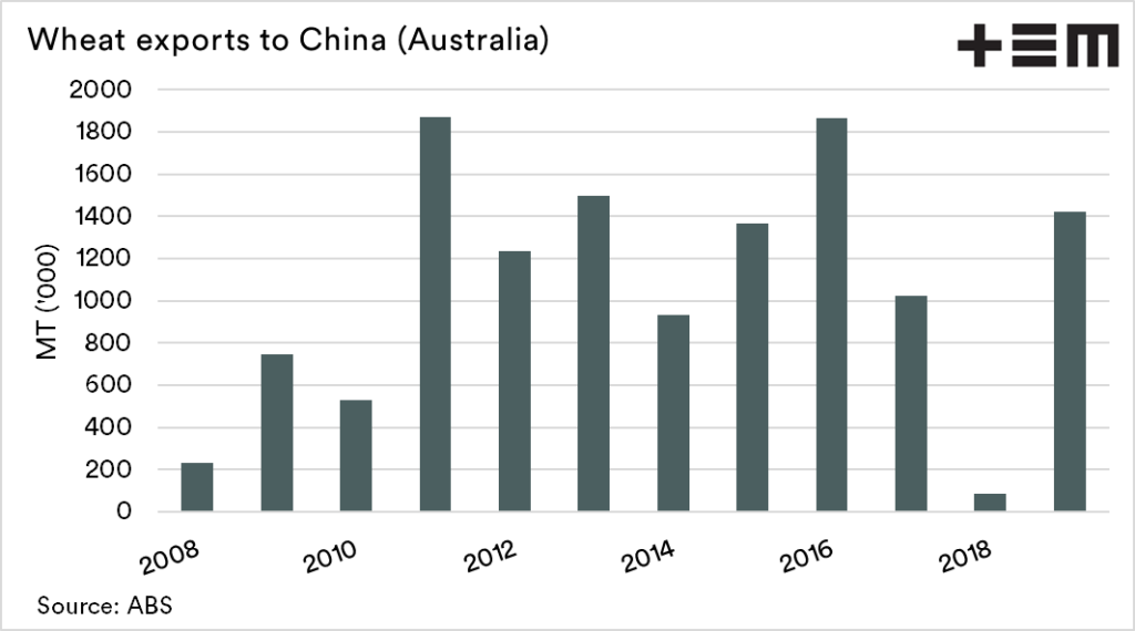 China is not as important to Australian wheat, as it is to barley. On average, since 2008, China has been a customer for 6% of our wheat exports. Interestingly 2018 was the lowest at 1% of exports, and 2019 the highest at 15%. That being said during the same period, we were responsible for an average of 39% of Chinese imports.