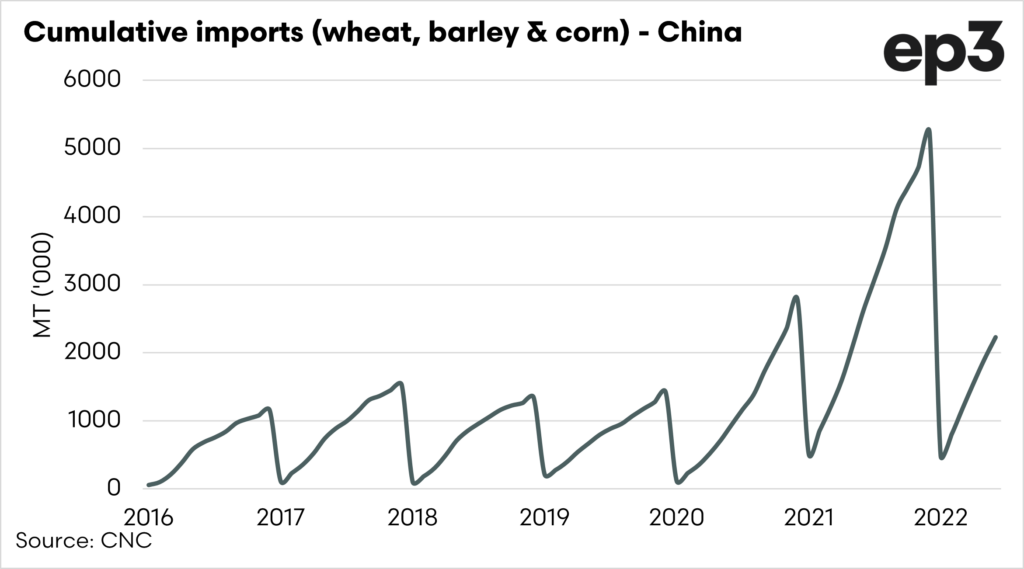The first chart below shows the cumulative imports of wheat, barley and corn combined. In this chart, we can see that 2020 and 2021 were well above the long-term average. This year the volume of imports has been above the longer-term average but well below last year.