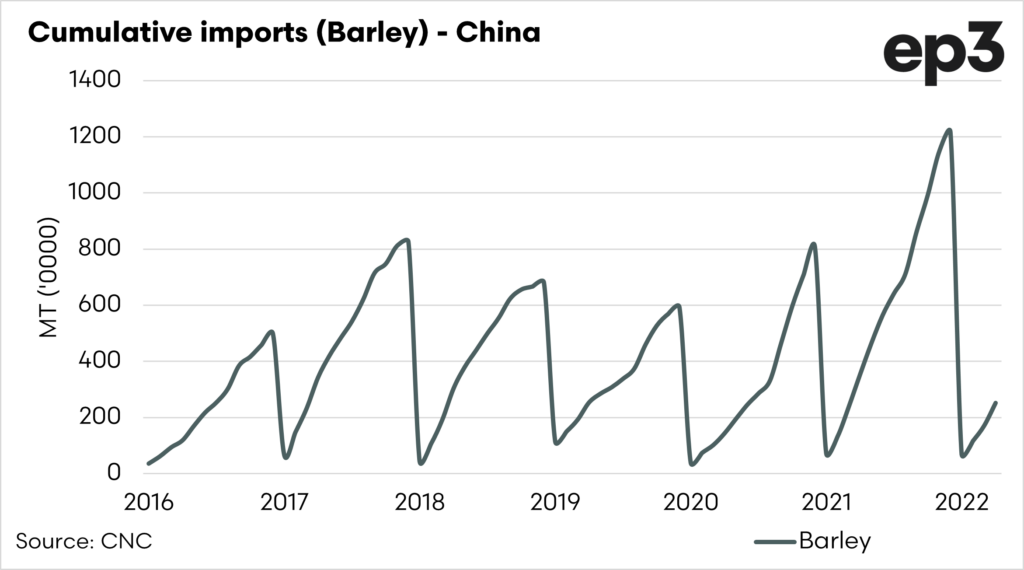 If we look specifically at barley, which they won’t purchase from Australia, volumes were extremely strong last year but have fallen by the wayside. They will likely be only slightly more than half of the longer-term (pre-2021) average.