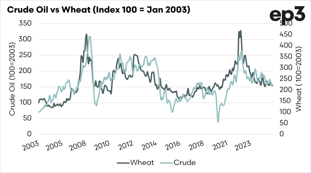 Crude oil and wheat prices often move together because of the strong link between energy costs and agricultural production. This relationship means that oil price volatility can ripple through to food markets, both positively and negatively.