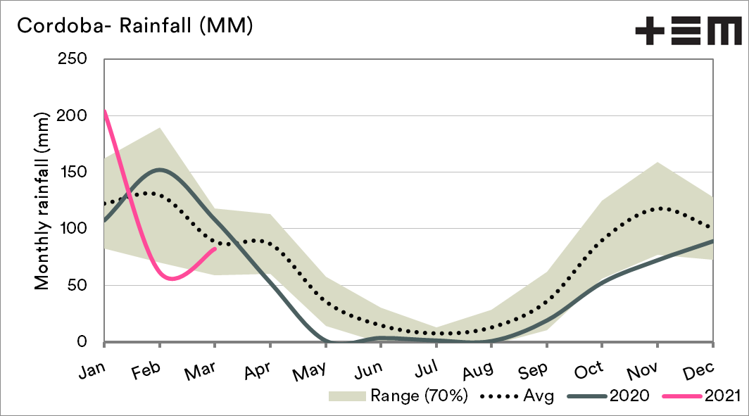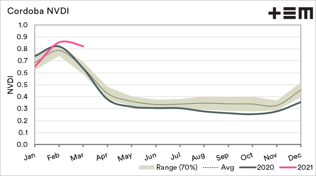 Interestingly, the NVDI for March in Cordoba is currently higher than seasonal expectations. There is generally a correlation between a high NVDI and yield, but this is not always 100% accurate and false signals are possible. Vegetation growth does not always correlate with yields.