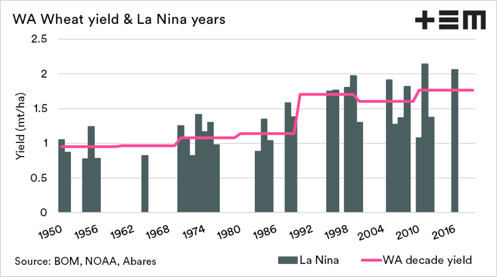 The nature of a La Nina event being neither wetter nor dryer has meant that during some years yields have been both lower and higher. The first chart below displays the La Nina years against the average yield for that decade for the period 1950-present. During this period there have been some well above average yield years, conversely with some meagre years.