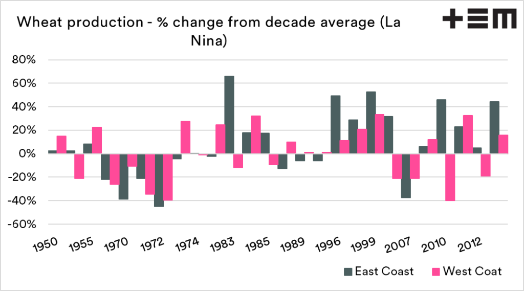 The second chart displays a comparison of production for the east coast states (incl SA). In years of La Nina production is much stronger on the east coast compared to the decade average than the west.