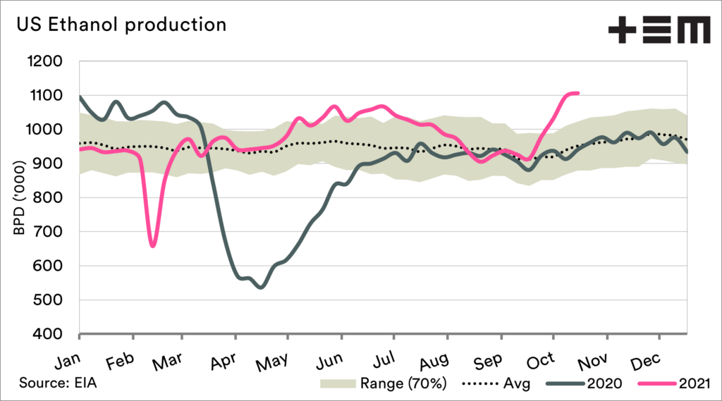 Whilst Australia (more so NSW/VIC) is slowly coming out of lockdown, the rest of the world is moving on. Energy pricing as you will be aware from our recent articles are skyrocketing, and this is assisting ethanol demand and pricing.