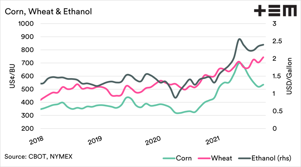 The summary is that corn is used to make ethanol in the US. If demand for ethanol rises, then corn in turns is positively impacted – which can flow through to wheat pricing.