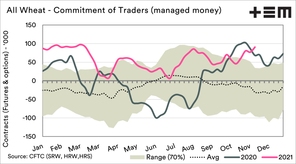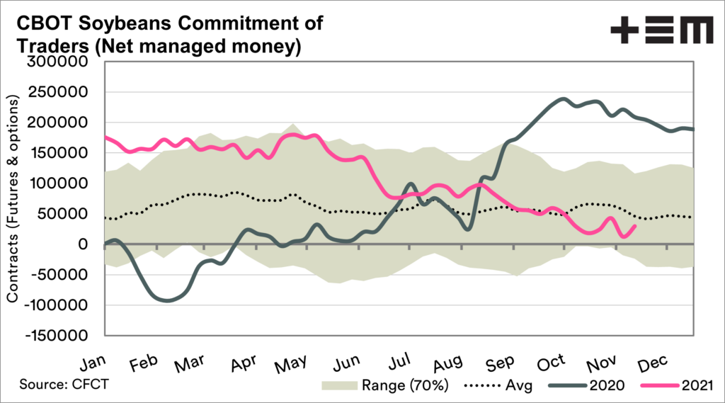 Soybeans have been on the rope in recent months after being strongly long for most of 2020 and 2021; they have a low net long compared to corn and wheat.