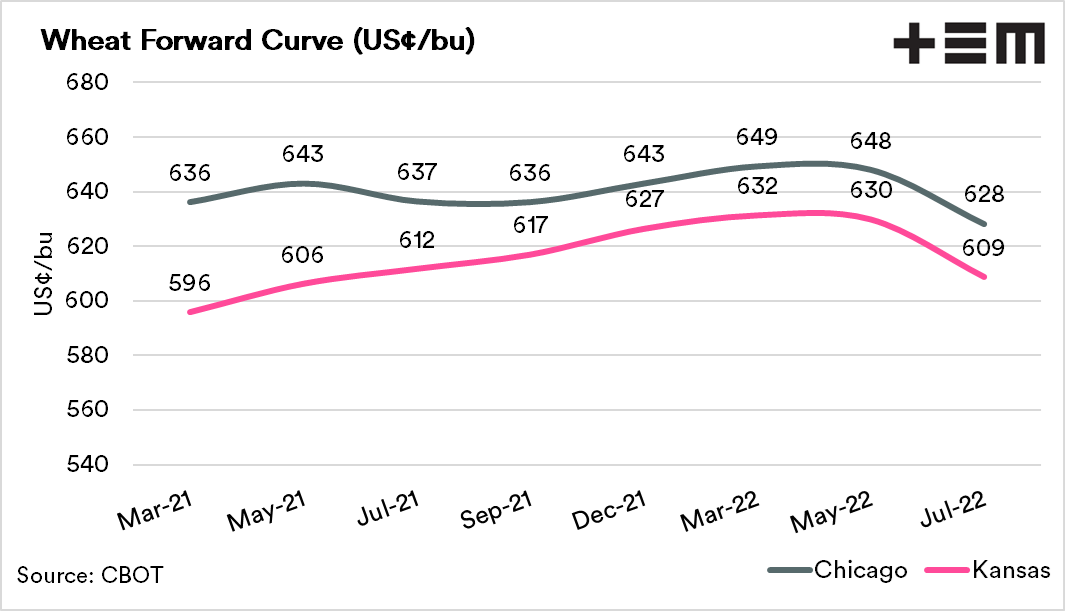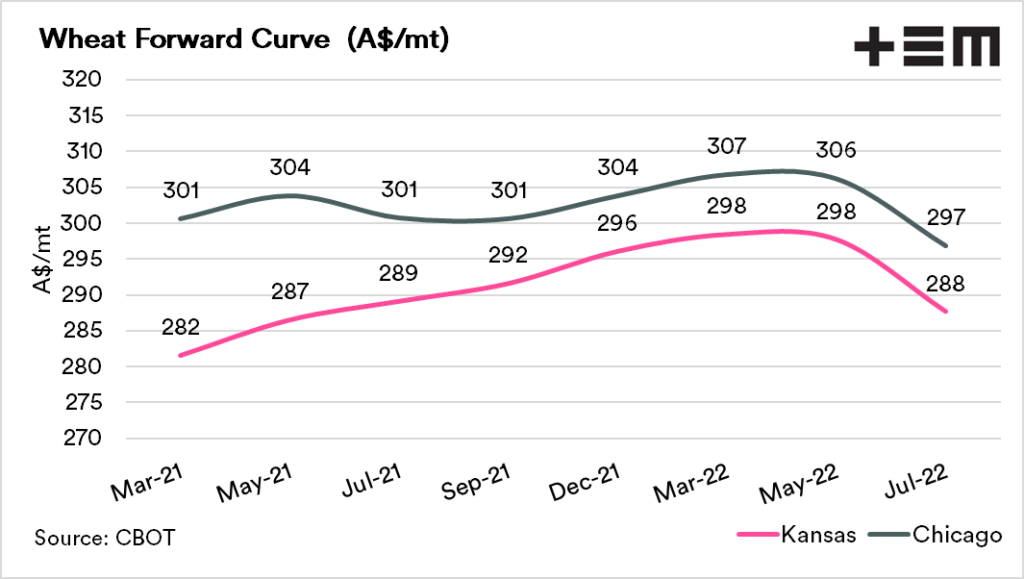 The curve gives an instant snapshot of where you could theoretically buy or sell the commodity. The below chart displays the forward curve for Kansas & Chicago wheat converted to A$/mt. This lets us know the price for each contract data between the spot (Mar 2021) contract and July 2022.