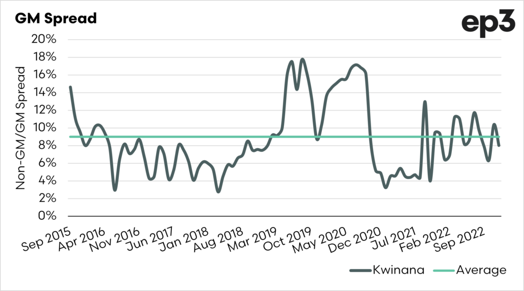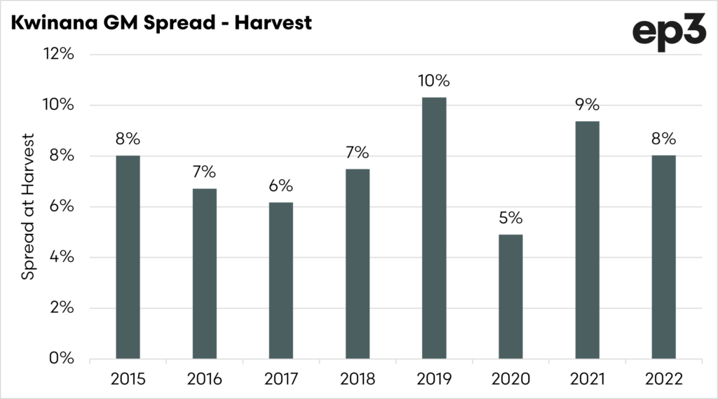 The second chart below shows the GM spread as a percentage. The average spread has been a 9% discount to GM since 2015. It has at times been as high as 18%. The third chart below shows the GM spread at harvest.