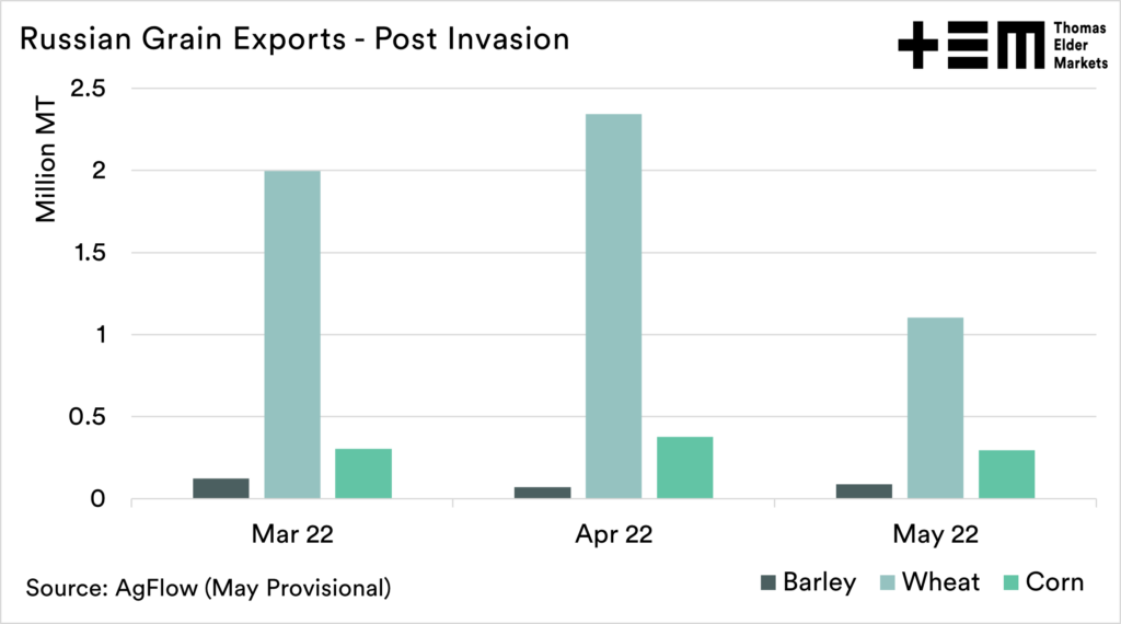 Using data from our partners at AgFlow, we are able to get an indication of export flows from Russia. While volumes are down, they are still strong. Sanctions and the poor perceptions towards Russia have only had a limited impact on grain exports.