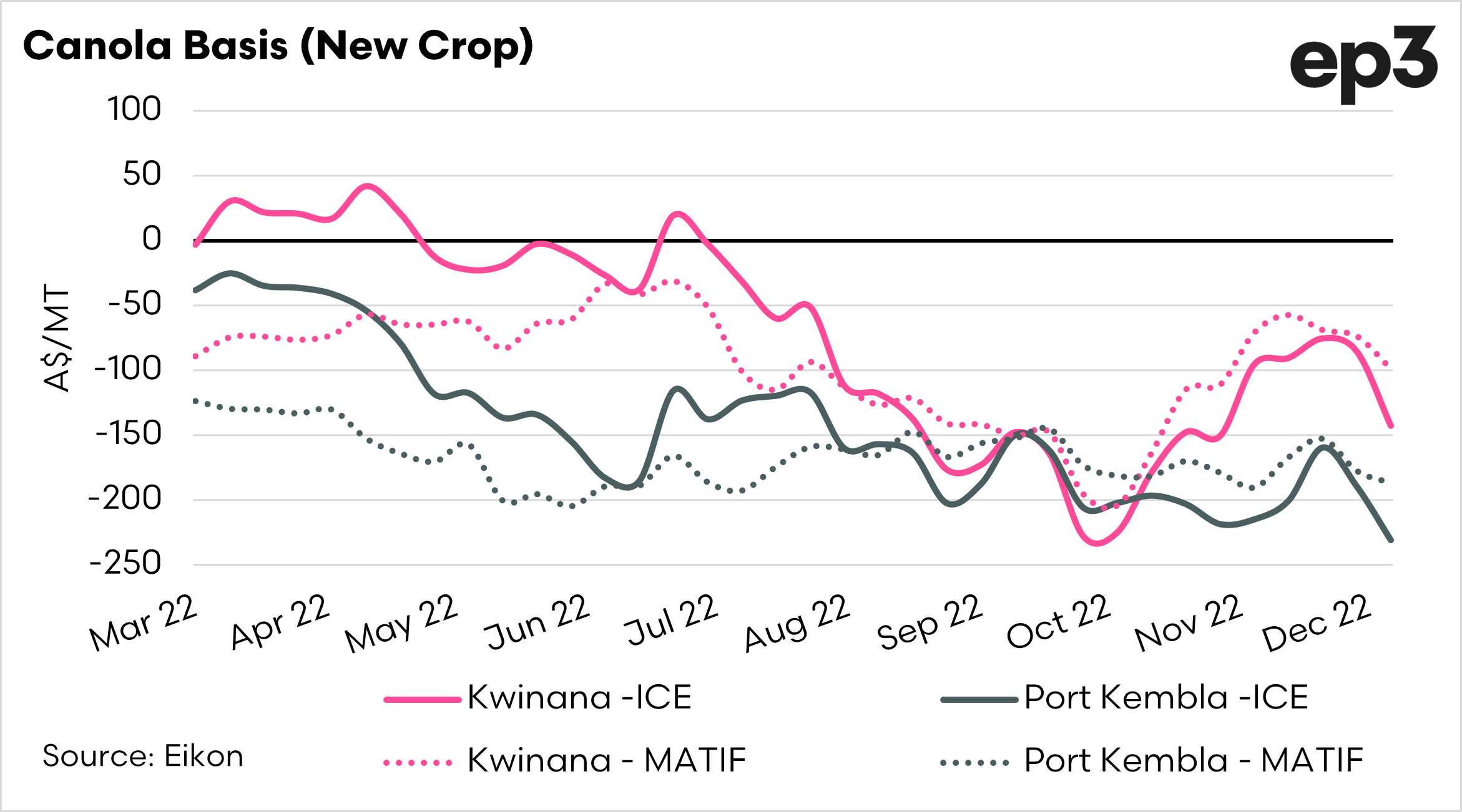 The first chart below shows the price of canola at a selection of port zones in Australia versus Canadian and French futures.