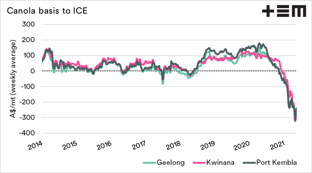 The old crop basis to ICE canola has improved but remains at huge discounts.