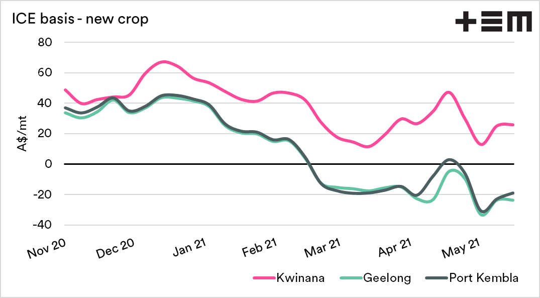 The basis between new crop and ICE remains at a discount in the eastern states; however, the west is receiving a premium.