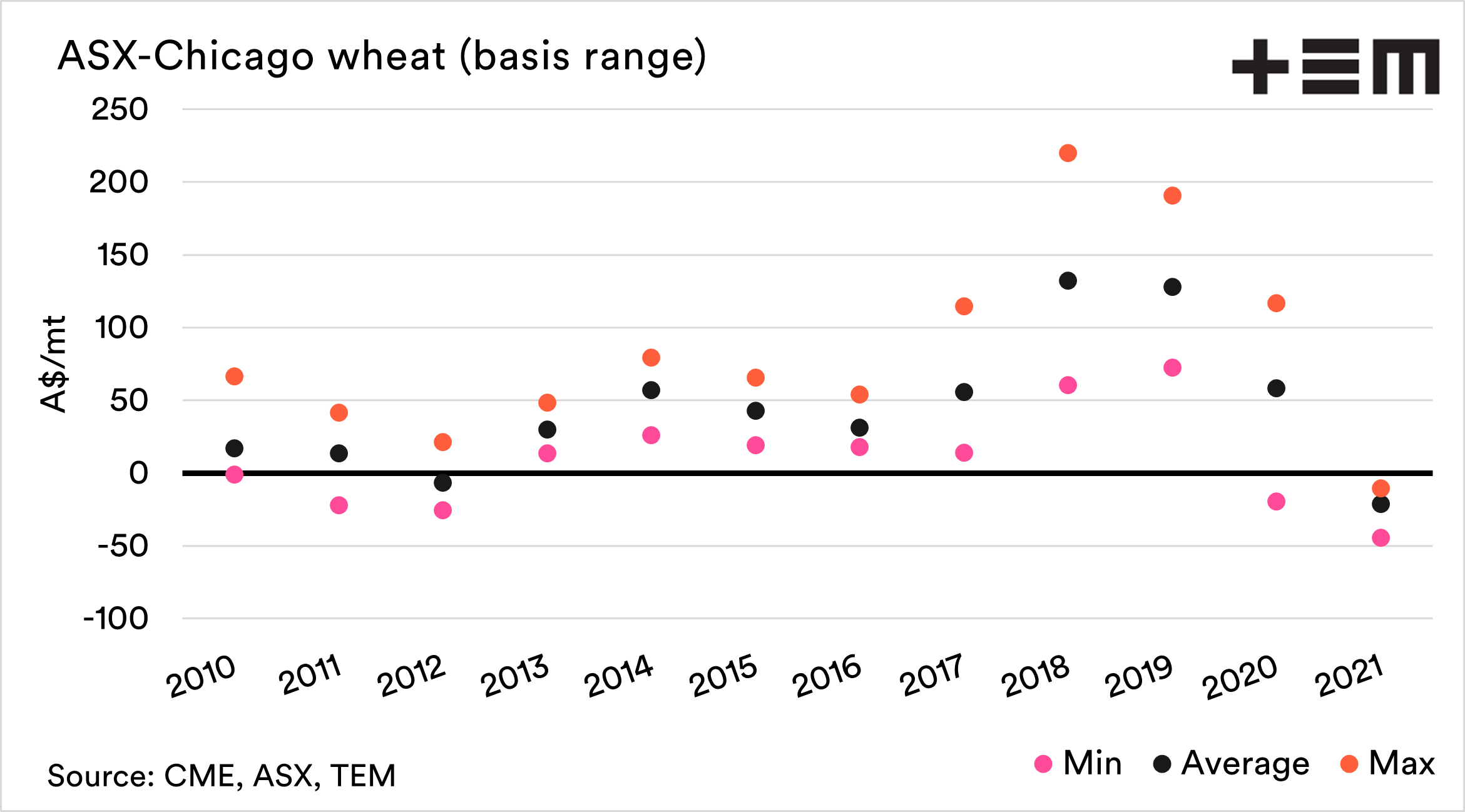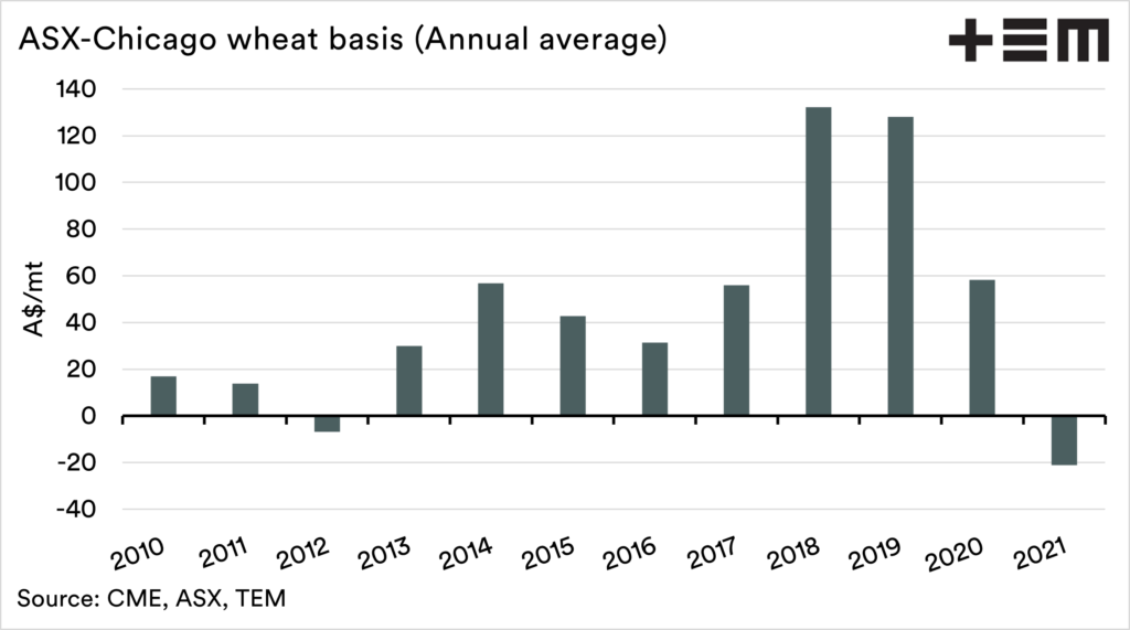 The first chart below shows the annual average basis between ASX wheat futures and CBOT wheat futures (spot contracts). At the mid-point of the year, ASX is trading at a discount of A$21/mt to CBOT. This is the lowest we have experienced since 2010.